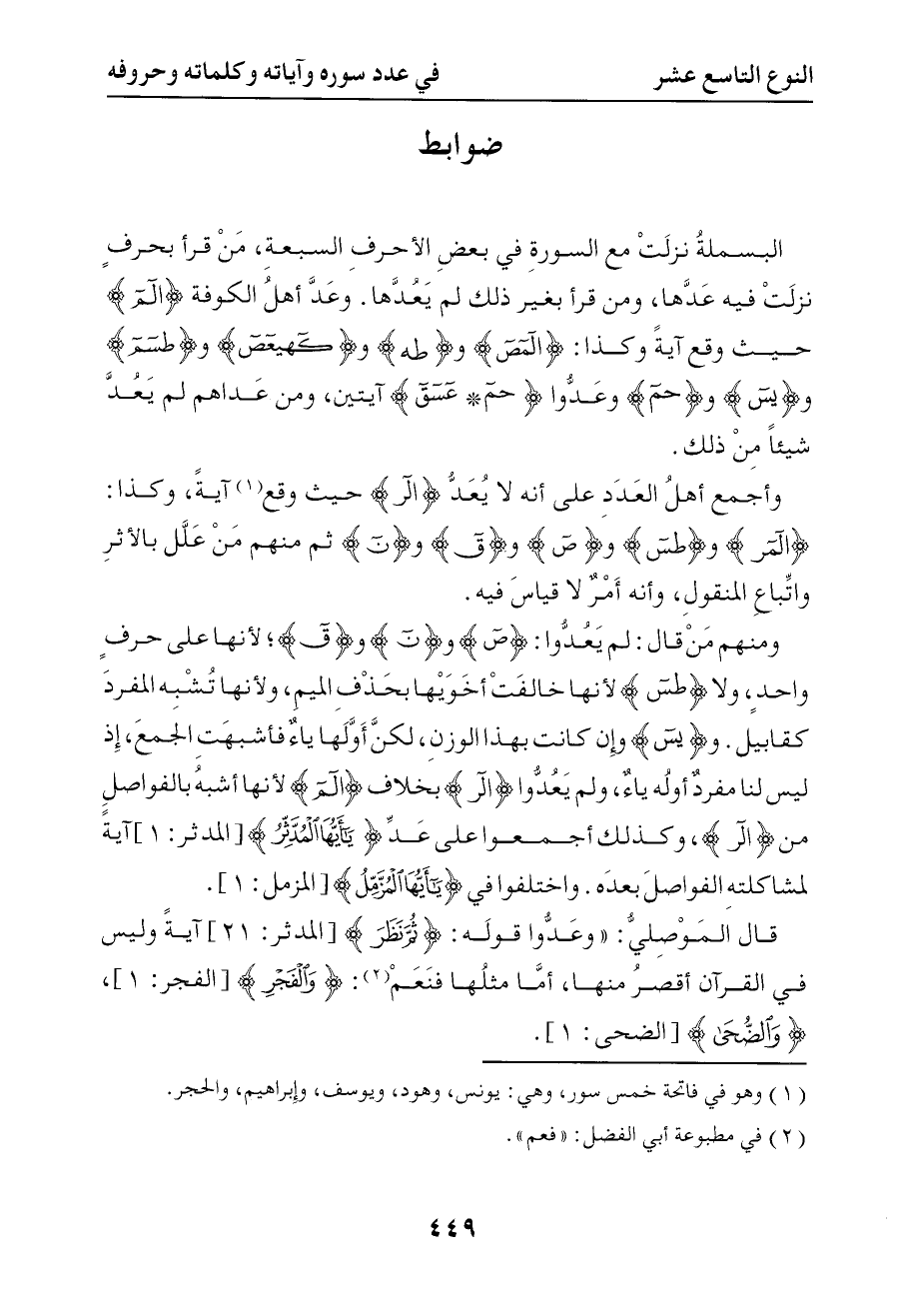 958 وأجمع أهل العدد على أنه لا يعد ألر حيث وقع آية وكذا ألمر وطس وص وق ون ثم منهم من علل بالأثر وإتباع المنقول وأنه أمر لا قياس فيه ومنهم من قال لم يعدوا ص ون وق لأنها على حرف واحد ولا طس لأنها خالفت أخويها بحذف الميم ولأنها تشبه المفرد كقابيل ويس وإن كانت بهذا الوزن لكن أولها ياء فأشبهت الجمع إذ ليس لنا مفرد أوله ياء ولم يعدوا ألر بخلاف ألم لأنها أشبه بالفواصل من ألر وكذلك أجمعوا على عد { يا أيها المدثر } آية لمشاكلته الفواصل بعده واختلفوا في { يا أيها المزمل }