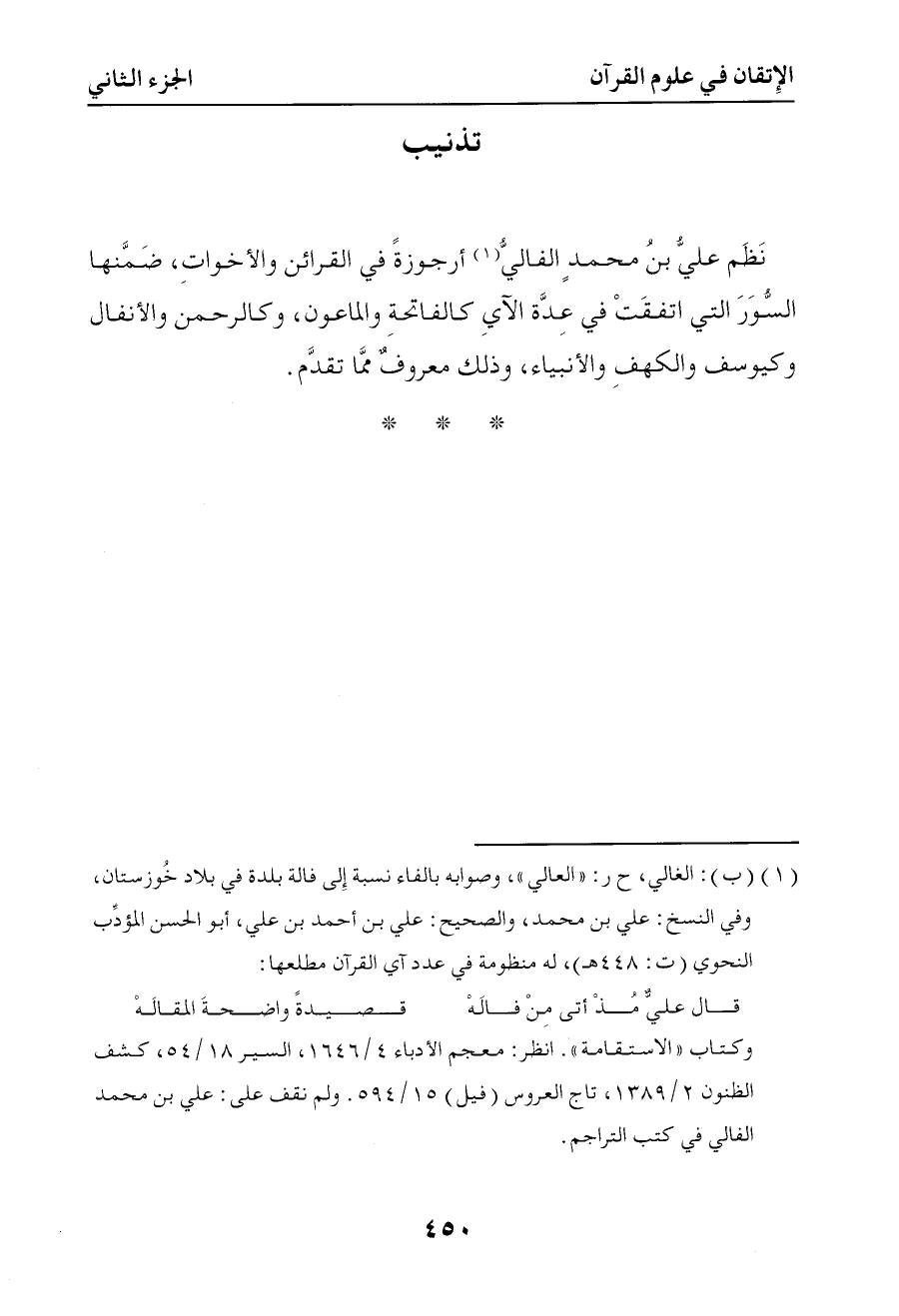 960 نظم علي بن محمد الغالي أرجوزة في القرائن والأخوات ضمنها السور التي اتفقت في عدة الآي كالفاتحة والماعون وكالرحمن والأنفال وكيوسف والكهف والأنبياء وذلك معروف مما تقدم