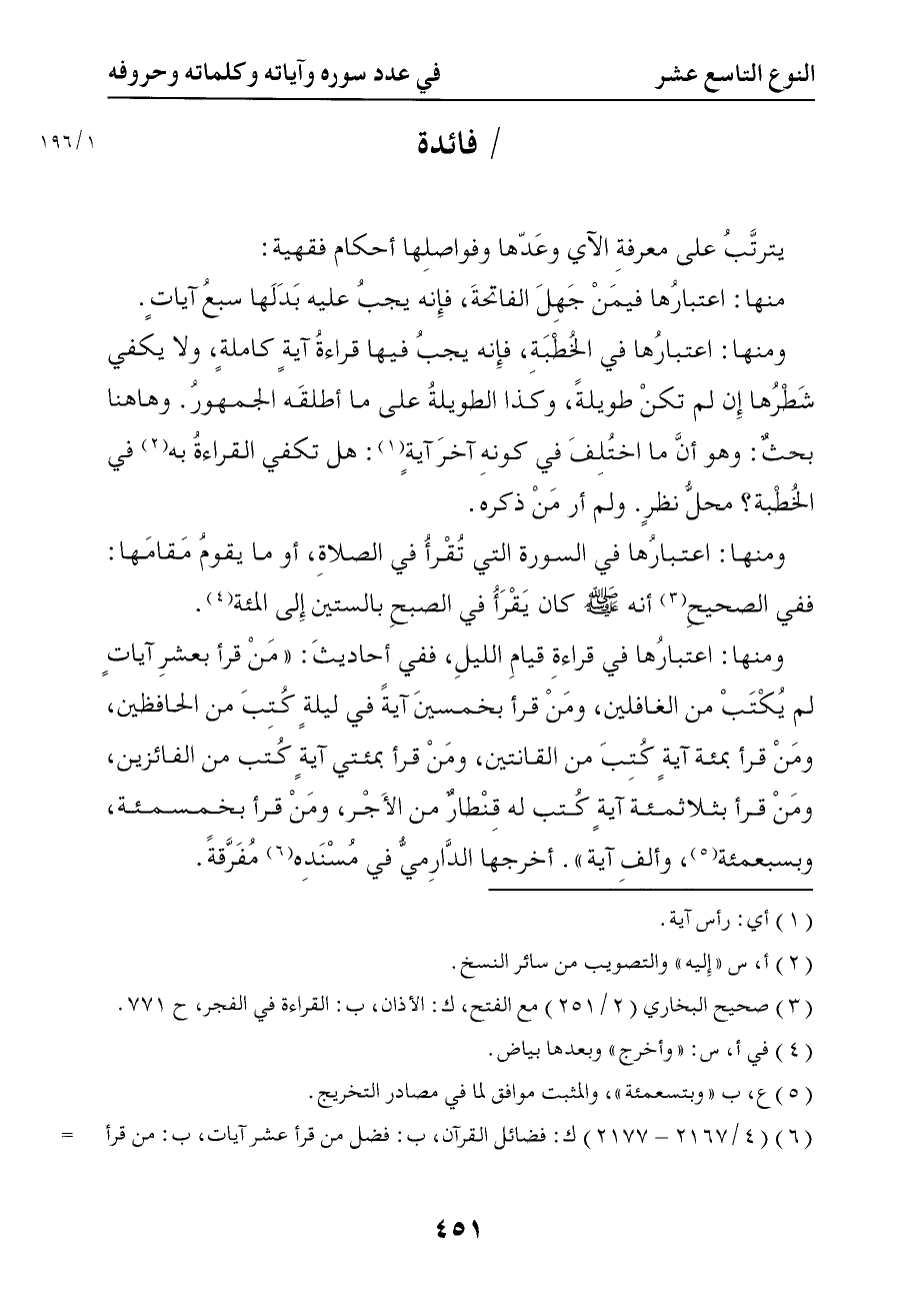 ومنها اعتبارها في قراءة قيام الليل ففي أحاديث من قرأ بعشر آيات لم يكتب من الغافلين ومن قرأ بخمسين آية في ليلة كتب من الحافظين ومن قرأ بمائة آية كتب من القانتين ومن قرأ بمائتي آية كتب من الفائزين ومن قرأ بثلاثمائة آية كتب له قنطار من الأجر ومن قرأ بخمسمائة وسبعمائة وألف آية . . . أخرجها الدارمي في مسنده مفرقة