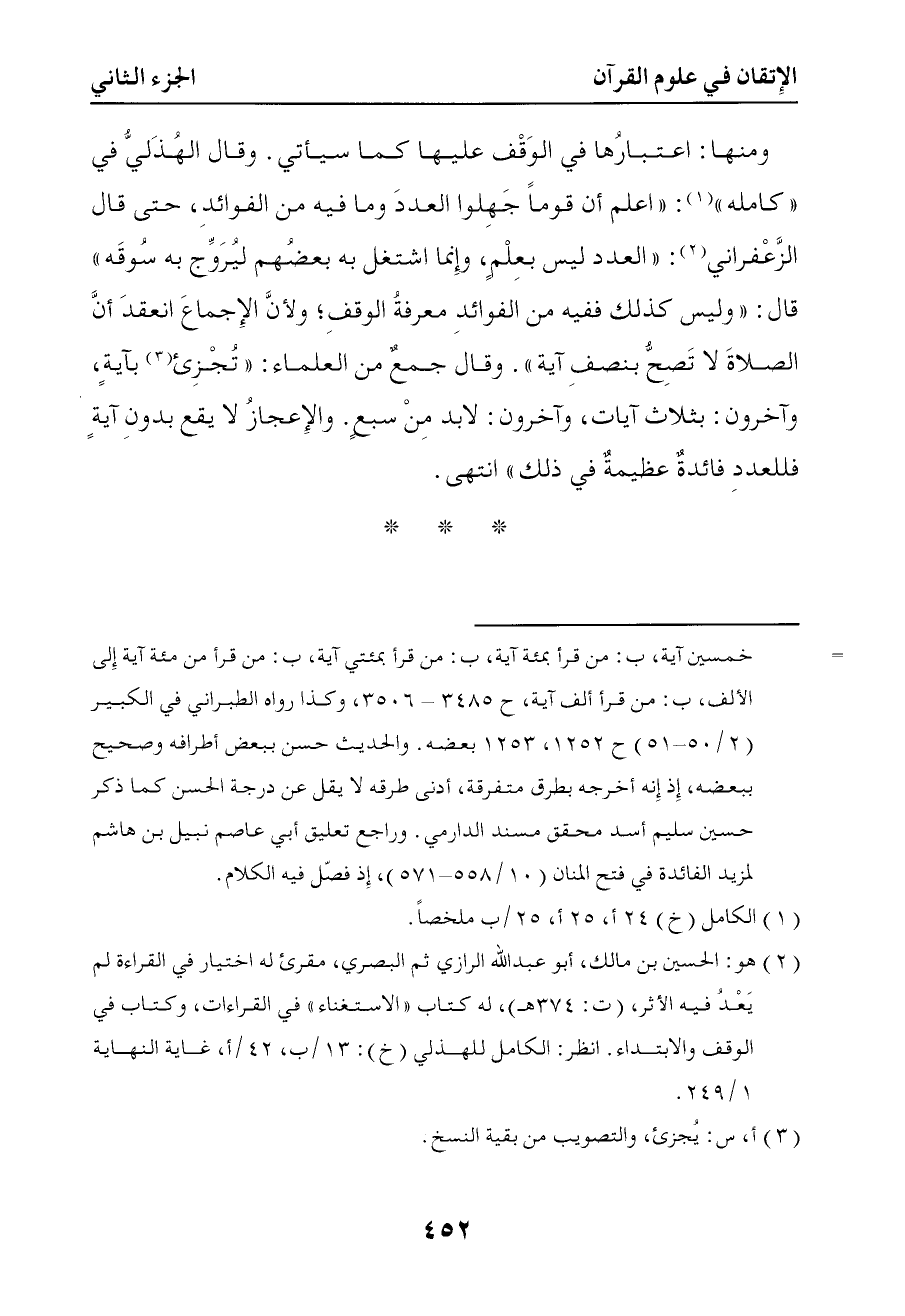 962 وقال الهذلي في كامله أعلم أن قوما جهلوا العدد وما فيه من الفوائد حتى قال الزعفراني العدد ليس بعلم وإنما اشتغل به بعضهم ليروج به سوقه قال وليس كذلك ففيه من الفوائد معرفة الوقف ولأن الإجماع انعقد على أن الصلاة لا تصح بنصف آية وقال جمع من العلماء تجزئ بآية وآخرون بثلاثة آيات وآخرون لا بد من سبع والإعجاز لا يقع بدون آية فللعدد فائدة عظيمة في ذلك انتهى