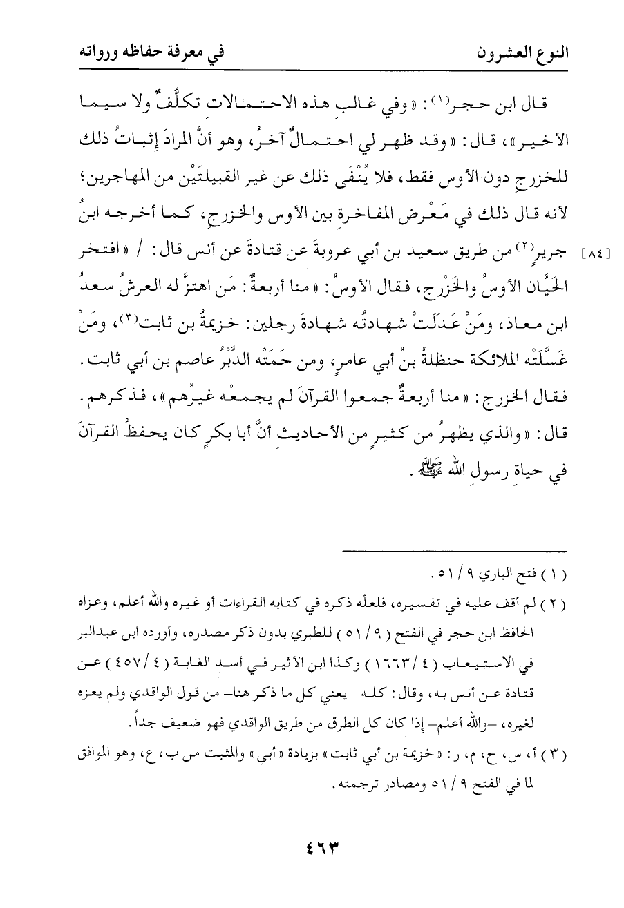 981 قال ابن حجر وفي غالب هذه الاحتمالات تكلف ولا سيما الأخير قال وقد ظهر لي احتمال آخر وهو أن المراد إثبات ذلك للخزرج دون الأوس فقط فلا ينفي ذلك عن غير القبيلتين من المهاجرين لأنه قال ذلك في معرض المفاخرة بين الأوس والخزرج كما أخرجه ابن جرير من طريق سعيد بن أبي عروبة عن قتادة عن أنس قال افتخر الحيان الأوس والخزرج فقال الأوس منا أربعة من اهتز له العرش سعد بن معاذ ومن عدلت شهادته رجلين خزيمة بن ثابت ومن غسلته الملائكة حنظلة بن أبي عامر ومن حمته الدبر عاصم بن أبي ثابت فقال الخزرج منا أربعة جمعوا القرآن لم يجمعه غيرهم فذكرهم