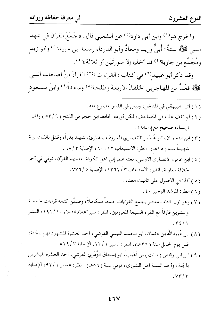 988 وقد ذكر أبو عبيد في كتاب القراءات القراء من أصحاب النبي صلى الله عليه وسلم فعد من المهاجرين الخلفاء الأربعة وطلحة وسعدا وابن مسعود