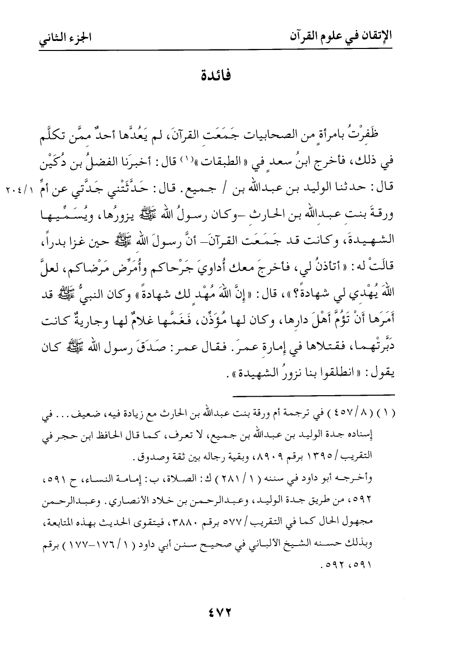 994 ظفرت بامرأة من الصحابيات جمعت القرآن لم يعدها أحد ممن تكلم في ذلك فأخرج ابن سعد في الطبقات أنبأنا الفضل بن دكين قال حدثنا الوليد بن عبد الله بن جميع قال حدثتني جدتي عن أم ورقة بنت عبد الله بن الحارث وكان رسول الله صلى الله عليه وسلم يزورها ويسميها الشهيدة وكانت قد جمعت القرآن أن رسول الله صلى الله عليه وسلم حين غزا بدرا قالت له أتأذن لي فأخرج معك أداوي جرحاكم وأمرض مرضاكم لعل الله يهدي لي شهادة قال إن الله مهد لك شهادة وكان صلى الله عليه وسلم قد أمرها أن تؤم أهل دارها وكان لها مؤذن فغمها غلام لها وجارية كانت دبرتهما فقتلاها في إمارة عمر فقال عمر صدق رسول الله صلى الله عليه وسلم كان يقول انطلقوا بنا نزور الشهيدة