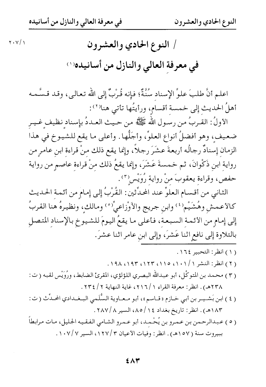 1011 أعلم أن طلب علو الإسناد سنة فإنه قرب إلى الله تعالى وقد قسمه أهل الحديث إلى خمسة أقسام ورأيتها تأتي هنا