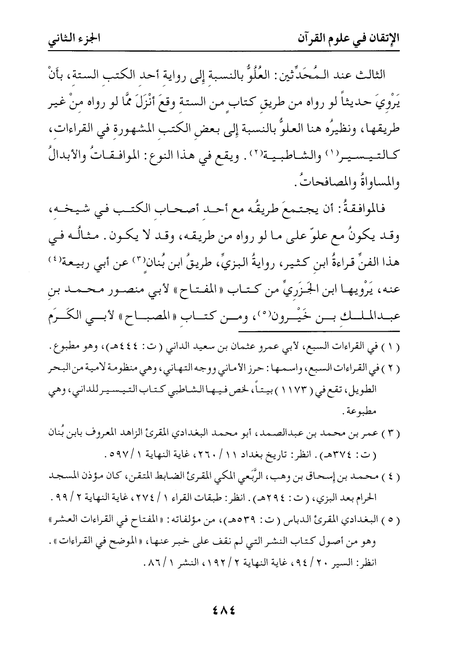1013 الثالث عند المحدثين العلو بالنسبة إلى رواية أحد الكتب الستة بأن يروي حديثا لو رواه من طريق كتاب من الستة وقع أنزل مما لو رواه من غير طريقها ونظيره هنا العلو بالنسبة إلى بعض الكتب المشهورة في القراءات كالتيسير والشاطبية ويقع في هذا النوع الموافقات والإبدال والمساواة والمصافحات