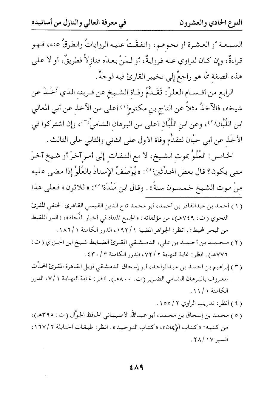 1019 الرابع من أقسام العلو تقدم وفاة الشيخ عن قرينه الذي أخذ عن شيخه فالآخذ مثلا عن التاج بن مكتوم أعلى من الآخذ عن أبي المعالي بن اللبان وعن ابن اللبان أعلى من البرهان الشامي وإن اشتركوا في الأخذ عن أبي حيان لتقدم وفاة الأول على الثاني والثاني على الثالث