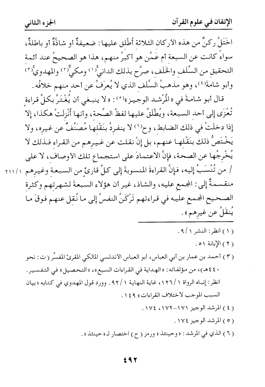 1024 قال أبو شامة في المرشد الوجيز لا ينبغي أن يغتر بكل قراءة تعزى إلى أحد السبعة ويطلق عليها لفظ الصحة وأنها أنزلت هكذا إلا إذا دخلت في ذلك الضابط وحينئذ لا ينفرد بنقلها مصنف عن غيره ولا يختص ذلك بنقلها عنهم بل إن نقلت عن غيرهم من القراء فذلك لا يخرجها عن الصحة فإن الاعتماد على