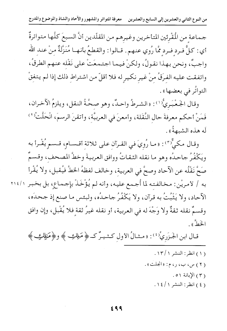 1034 قالوا والقطع بأنها منزلة من عند الله واجب ونحن بهذا نقول ولكن فيما اجتمعت على نقله عنهم الطرق واتفقت عليه الفرق من غير نكير له فلا أقل من اشتراط ذلك إذا لم يتفق التواتر في بعضها