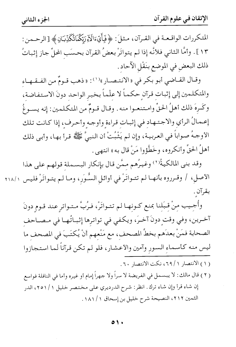 1059 وقد بنى المالكية وغيرهم ممن قال بإنكار البسملة قولهم على هذا الأصل وقرروه بأنها لم تتواتر في أوائل السور وما لم يتواتر فليس بقرآن