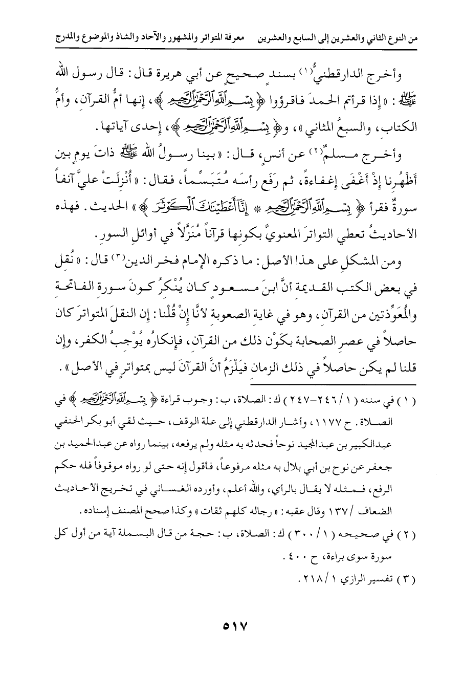 1079 ومن المشكل على هذا الأصل ما ذكره الإمام فخر الدين قال نقل في بعض الكتب القديمة أن ابن مسعود كان ينكر كون سورة الفاتحة والمعوذتين من القرآن وهو في غاية الصعوبة لأنا إن قلنا إن النقل المتواتر كان حاصلا في عصر الصحابة بكون ذلك من القرآن فإنكاره يوجب الكفر وإن قلنا لم يكن حاصلا في ذلك الزمان فيلزم أن القرآن ليس بمتواتر في الأصل