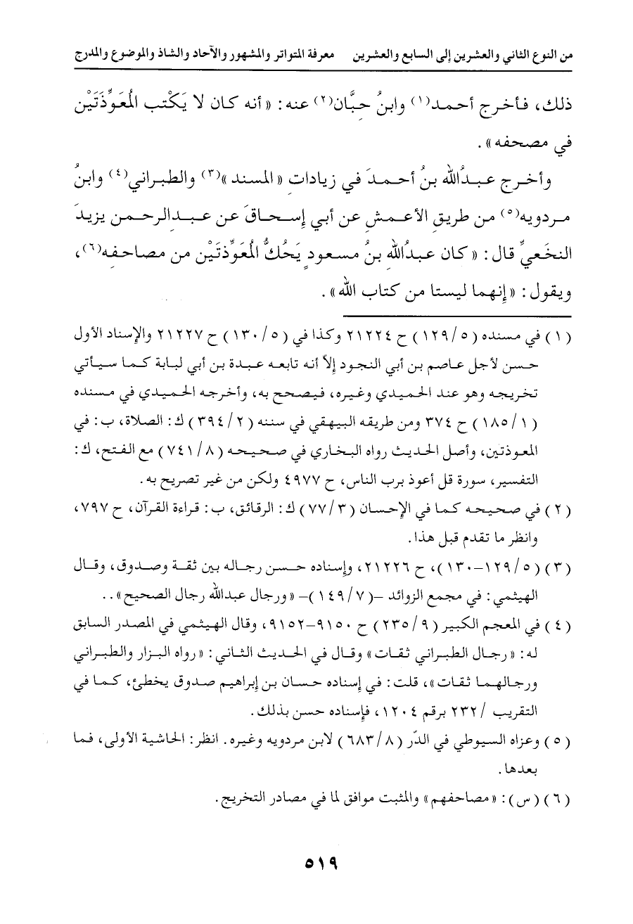 1083 وأخرج عبد الله بن أحمد في زيادات المسند والطبراني وابن مردويه من طريق الأعمش عن أبي إسحاق عن عبد الرحمن بن يزيد النخعي قال كان عبد الله بن مسعود يحك المعوذتين من مصاحفه ويقول إنهما ليستا من كتاب الله