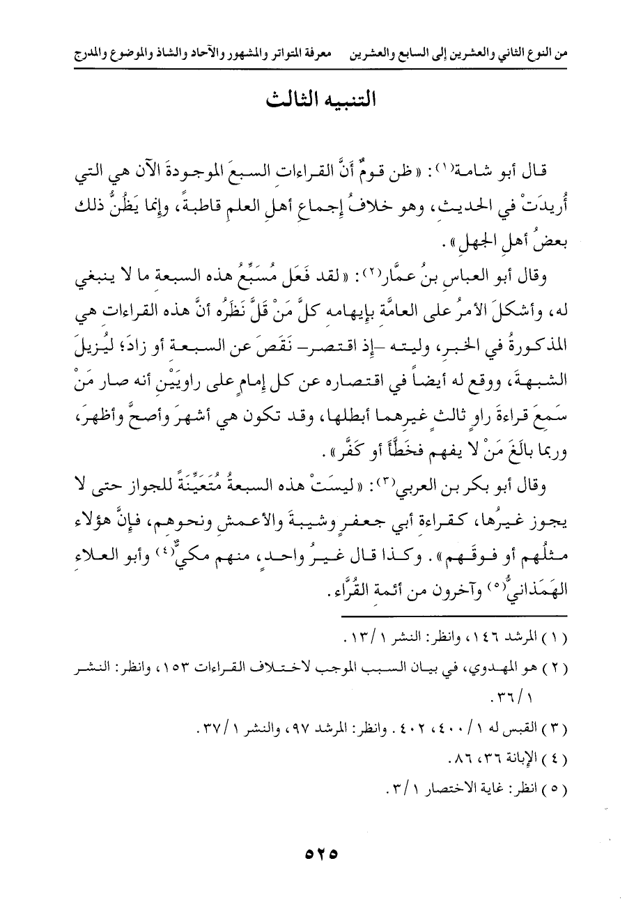 1093 قال أبو شامة ظن قوم أن القراءات السبع الموجودة الآن هي التي أريدت في الحديث وهو خلاف إجماع أهل العلم قاطبة وإنما يظن ذلك بعض أهل الجهل