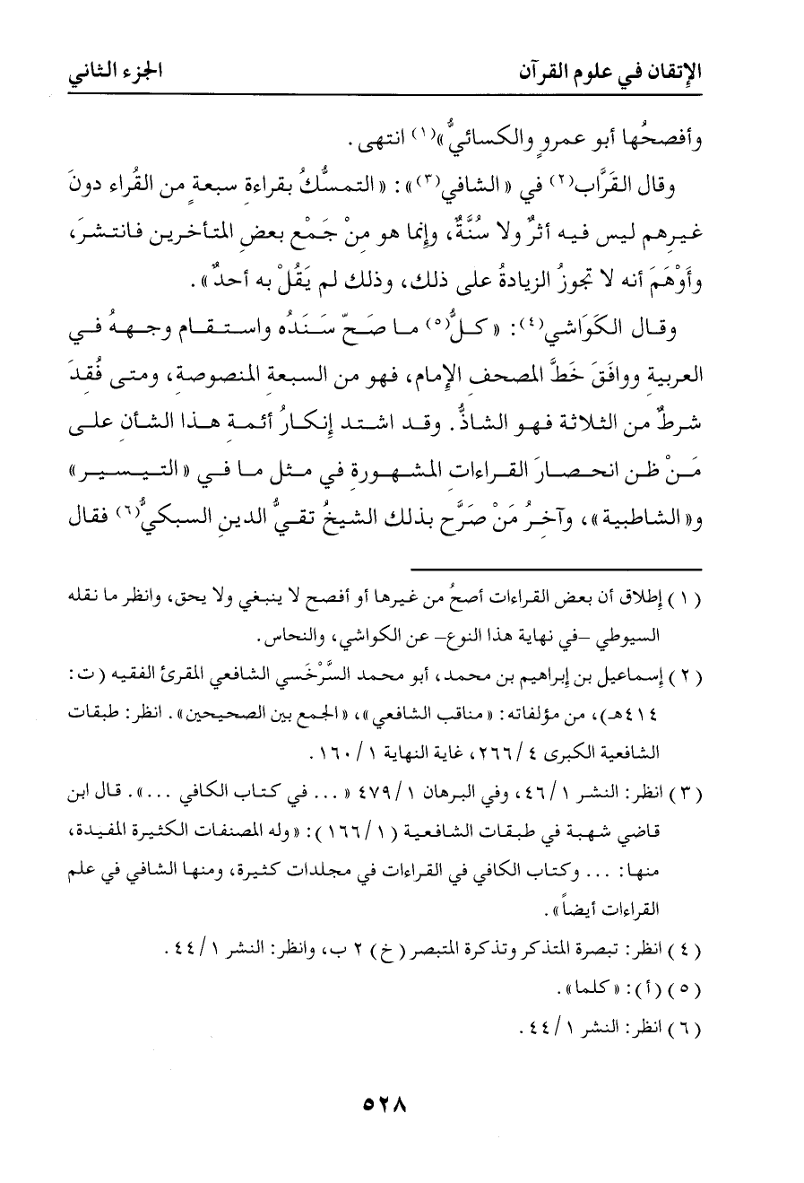 1100 وقد اشتد إنكار أئمة هذا الشأن على من ظن انحصار القراءات المشهورة في مثل ما في التيسير والشاطبية وآخر من صرح بذلك الشيخ تقي الدين