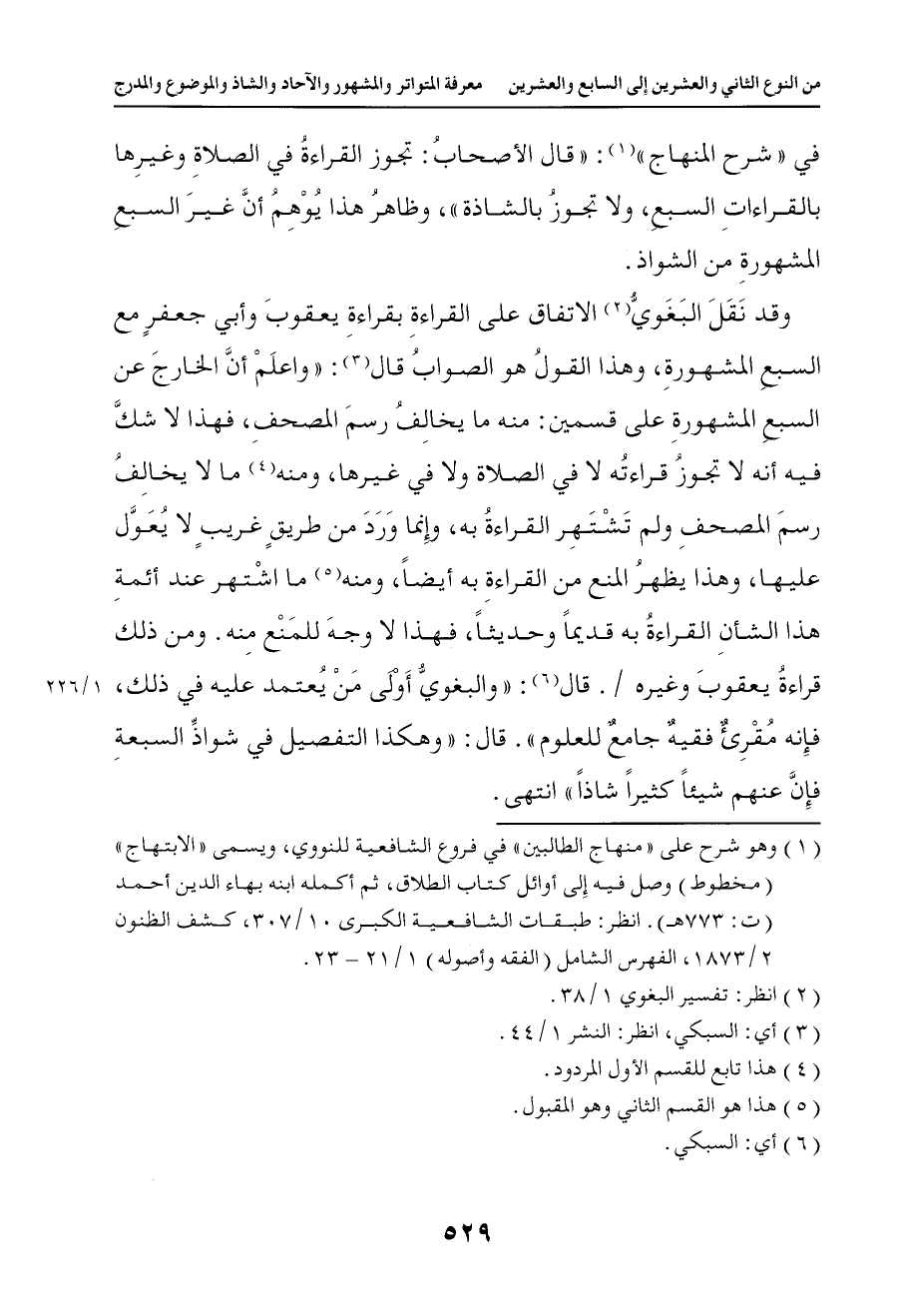 1102 قال والبغوي أولى من يعتمد عليه في ذلك فإنه مقرئ فقيه جامع للعلوم . . . قال وهكذا التفصيل في شواذ السبعة فإن عنهم شيئا كثيرا شاذا انتهى