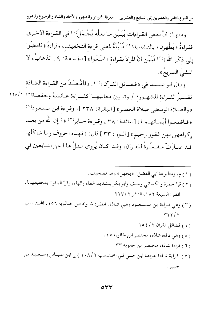 1107 وقال أبو عبيد في فضائل القرآن المقصد من القراءة الشاذة تفسير القراءة المشهورة وتبيين معانيها كقراءة عائشة وحفصة والصلاة الوسطى صلاة العصر وقراءة ابن مسعود فاقطعوا أيمانهما وقراءة جابر فإن الله من بعد إكراههن لهن غفور رحيم قال فهذه الحروف وما شاكلها قد صارت مفسرة للقرآن وقد كان يروى مثل هذا عن التابعين في