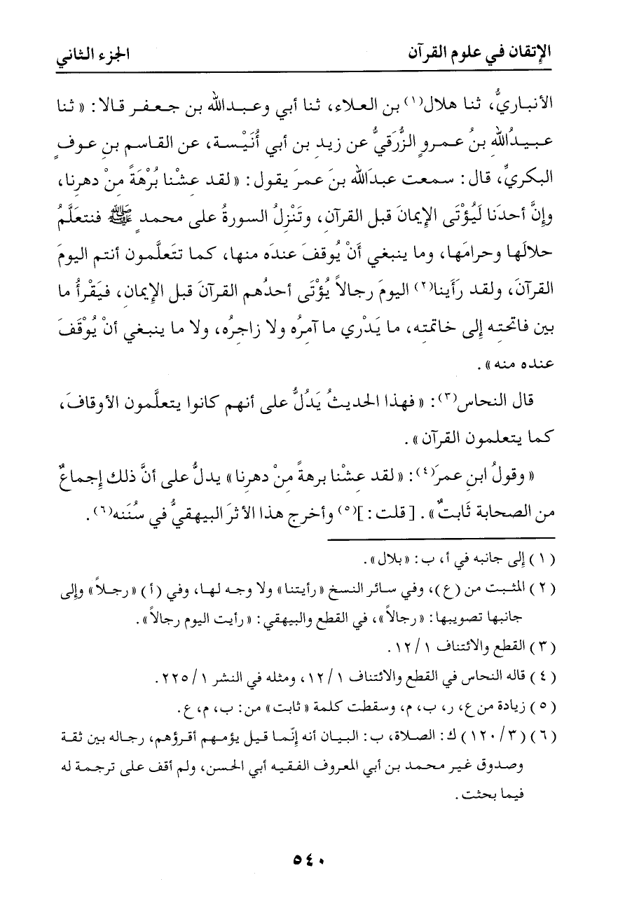 الأنباري حدثنا هلال بن العلاء بن أبي وعبد الله بن جعفر قالا حدثنا عبد الله بن عمر الزرقي عن زيد بن أبي أنيسة عن القاسم بن عوف البكري قال سمعت عبد الله ابن عمر يقول لقد عشنا برهة من دهرنا وإن أحدنا ليؤتى الإيمان قبل القرآن وتنزل السورة على محمد صلى الله عليه وسلم فنتعلم حلالها وحرامها وما ينبغي أن يوقف عنده منها كما تتعلمون أنتم القرآن اليوم ولقد رأينا اليوم رجالا يؤتى أحدهم القرآن قبل الإيمان فيقرأ ما بين فاتحته إلى خاتمته ما يدري ما آمره ولا زاجره ولا ما ينبغي أن يوقف عنده منه قال النحاس فهذا الحديث يدل على أنهم كانوا يتعلمون الأوقاف كما يتعلمون القرآن