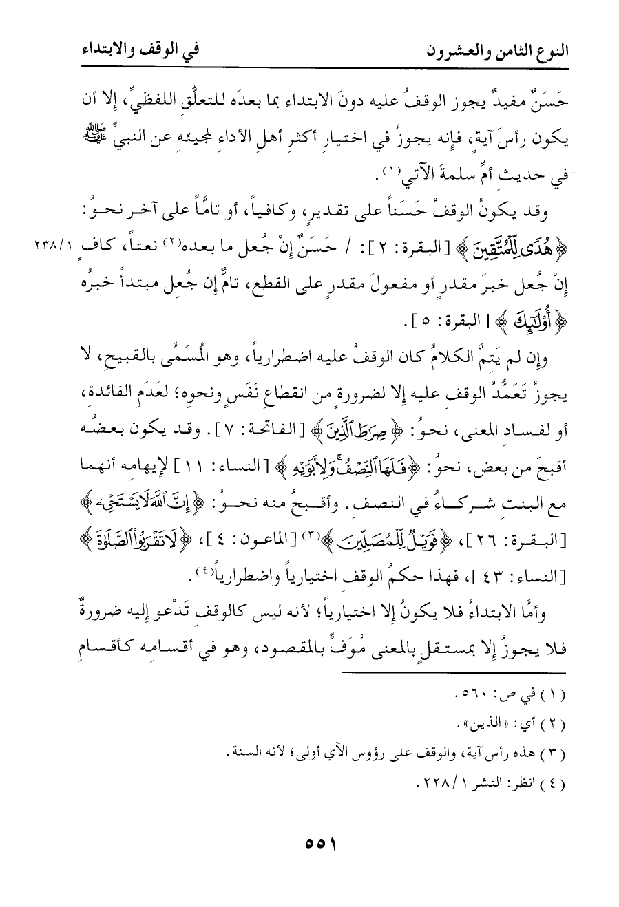 وإن لم يتم الكلام كان الوقف عليه اضطراريا وهو المسمى بالقبيح لا يجوز تعمد الوقف عليه إلا لضرورة من انقطاع نفس ونحوه لعدم الفائدة أو لفساد المعنى نحو { صراط الذين }