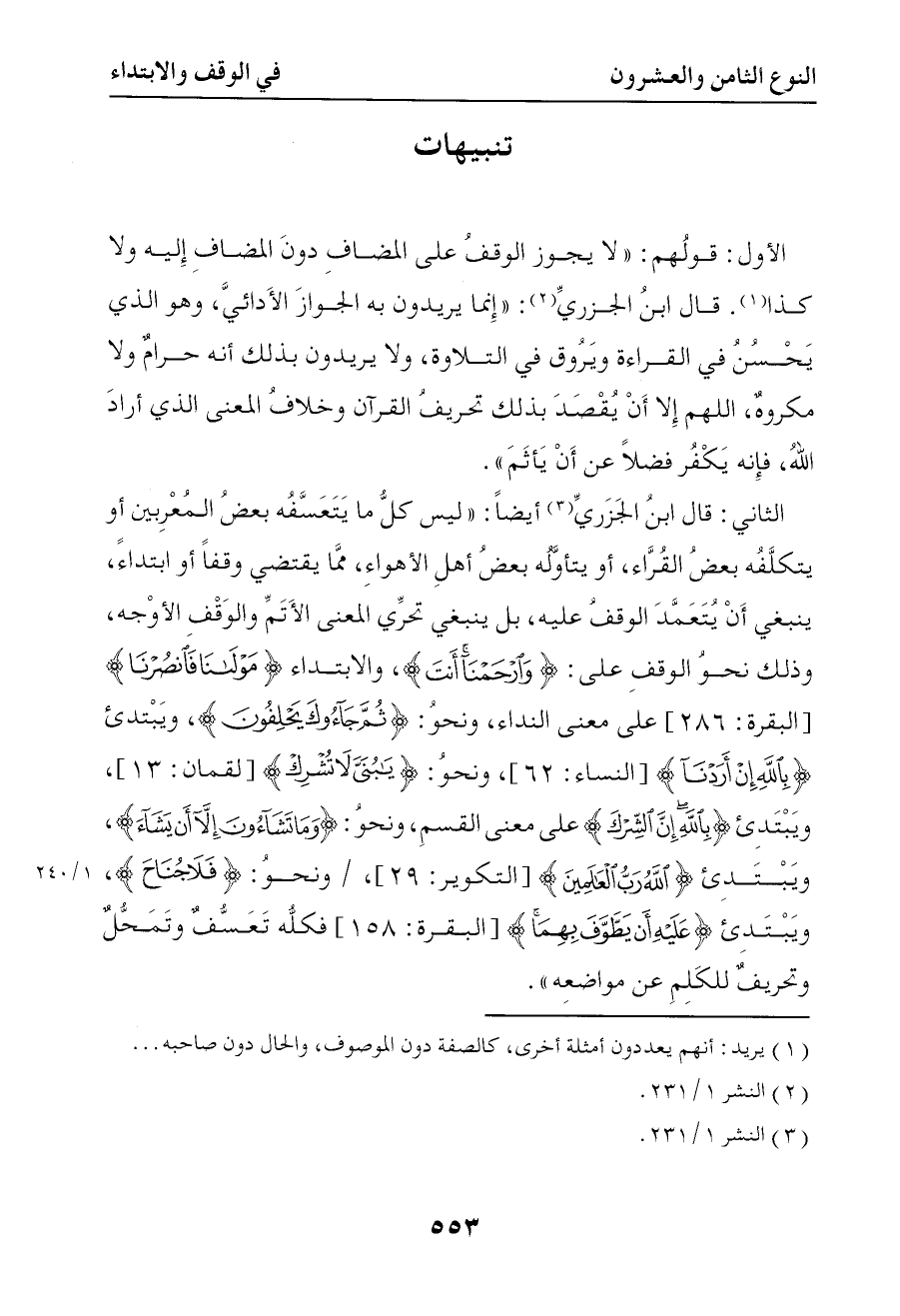 1133 قولهم لا يجوز الوقف على المضاف دون المضاف إليه ولا كذا قال ابن الجزري إنما يريدون به الجواز الأدائي وهو الذي يحسن في القراءة ويروق في التلاوة ولا يريدون بذلك أنه حرام ولا مكروه اللهم إلا أن يقصد بذلك تحريف القرآن وخلاف المعنى الذي أراده الله فإنه يكفر فضلا عن أن يأثم الثاني