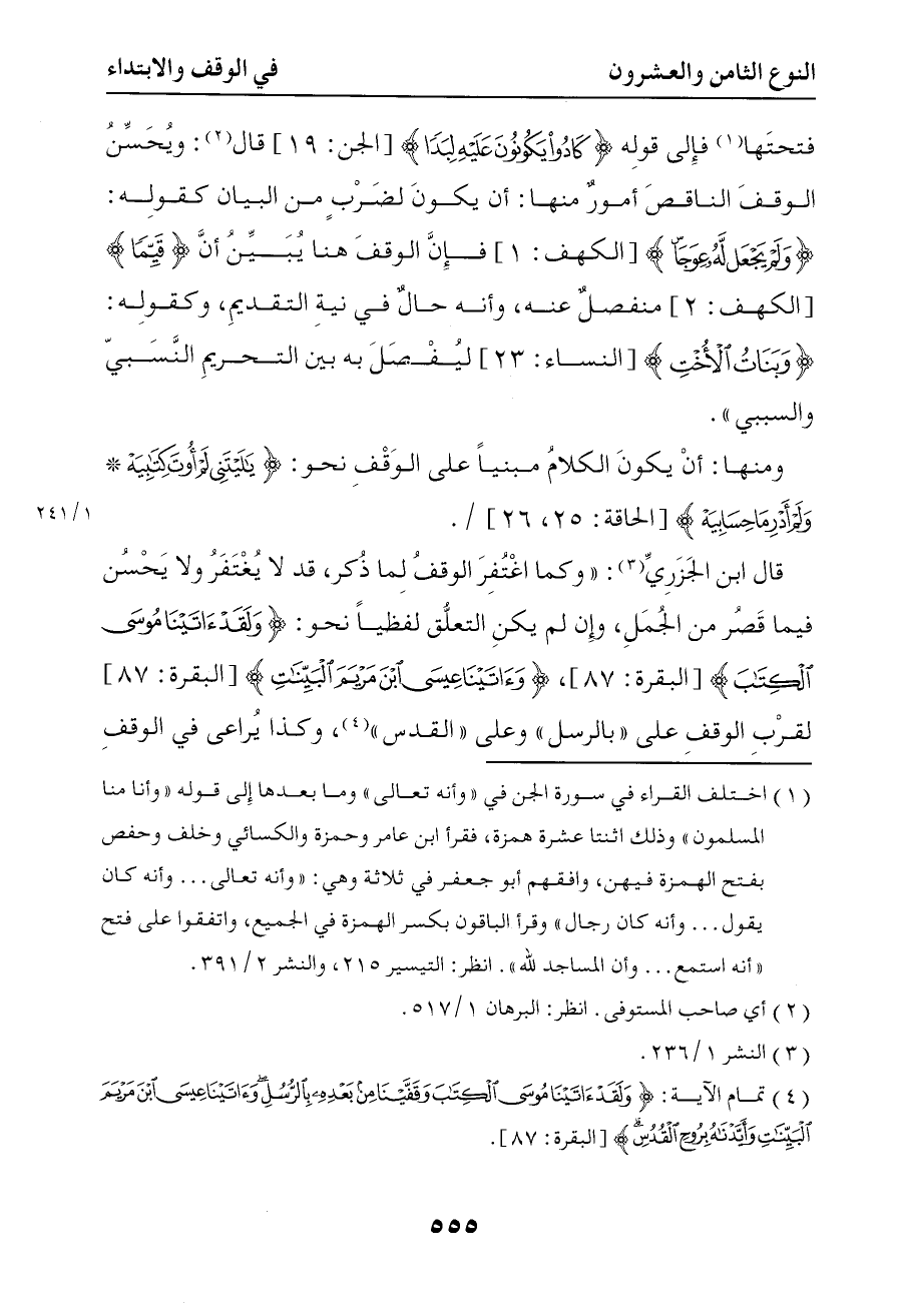 1139 قال ابن الجزري وكما اغتفر الوقف لما ذكر قد لا يغتفر ولا يحسن فيما قصر من الجمل وإن لم يكن التعلق لفظيا نحو { ولقد آتينا موسى الكتاب } { وآتينا عيسى ابن مريم البينات } لقرب الوقف على { بالرسل } وعلى { القدس } وكذا يراعى في الوقف