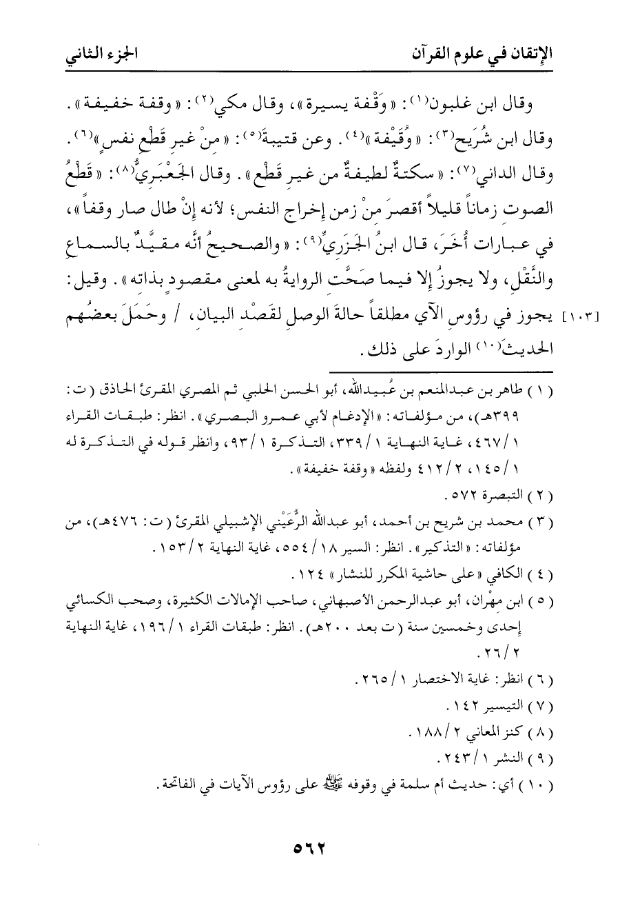 1149 قال ابن الجزري والصحيح أنه مقيد بالسماع والنقل ولا يجوز إلا فيما صحت الرواية به لمعنى مقصود بذاته وقيل يجوز في رؤوس الآي مطلقا حالة الوصل لقصد البيان وحمل بعضهم الحديث الوارد على ذلك