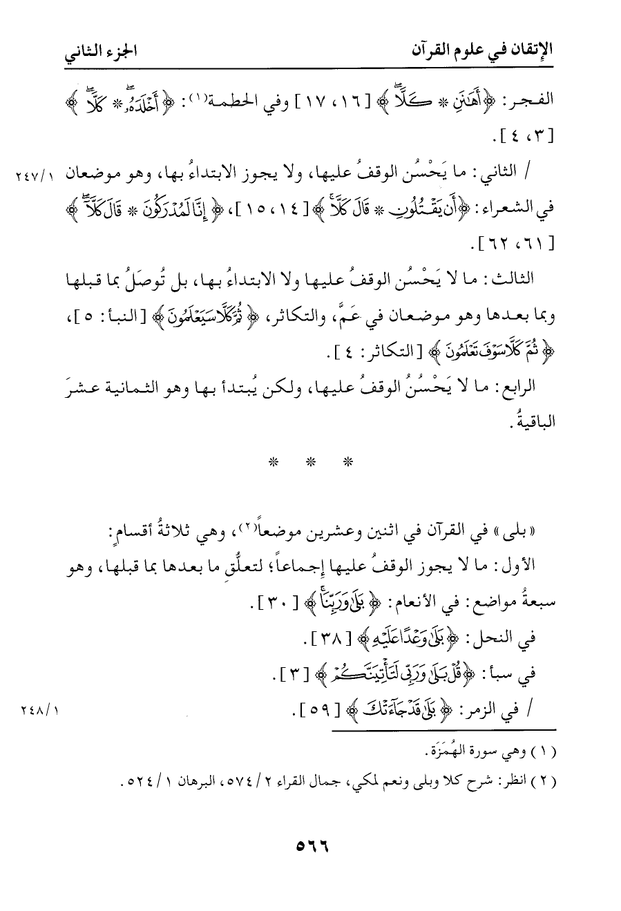 الثاني ما يحسن الوقف عليها ولا يجوز الابتداء بها وهو موضعان في الشعراء { أن يقتلون قال كلا } { إنا لمدركون قال كلا }