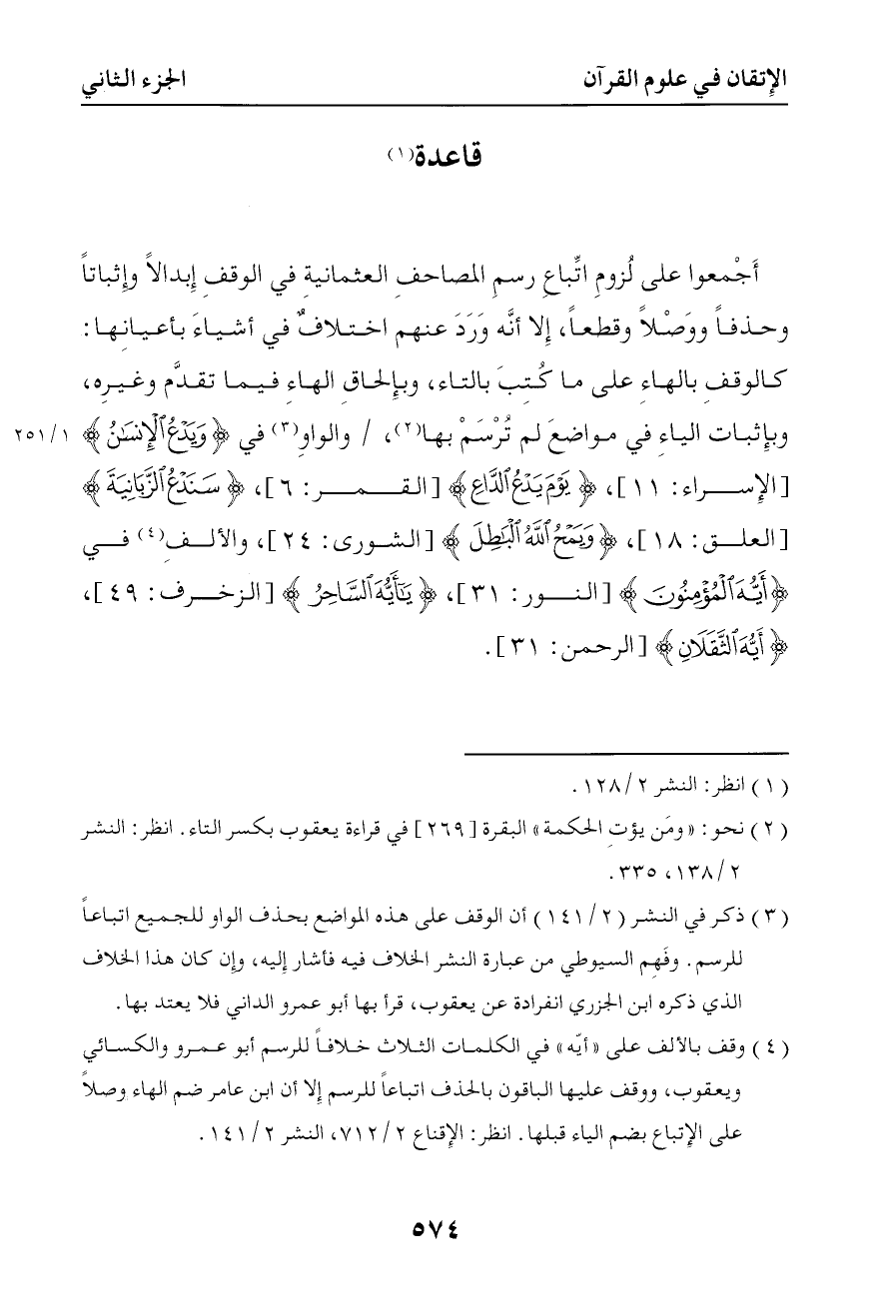 1170 أجمعوا على لزوم اتباع رسم المصاحف العثمانية في الوقف إبدالا وإثباتا وحذفا ووصلا وقطعا إلا أنه ورد عنهم اختلاف في أشياء بأعيانها كالوقف بالهاء على ما كتب بالتاء وبإلحاق الهاء فيما تقدم وغيره وبإثبات الياء في مواضع لم ترسم بها والواو في { ويدع الإنسان } { يوم يدع الداع } { سندع الزبانية } و { ويمح الله الباطل } والألف في أيه المؤمنون أيه الساحر أيه الثقلان
