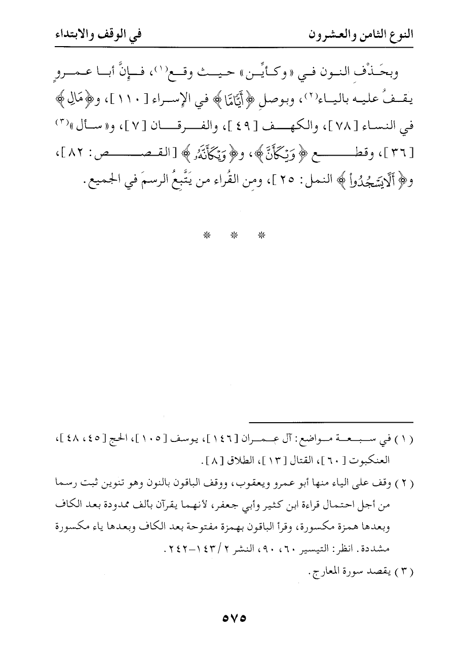 وتحذف النون في { وكأين } حيث وقع فإن أبا عمرو يقف عليه بالياء ويوصل { أياما } في الإسراء و { مال } في النساء والكهف والفرقان وسأل وقطع { ويكأن } { ويكأنه } و { ألا يسجدوا }