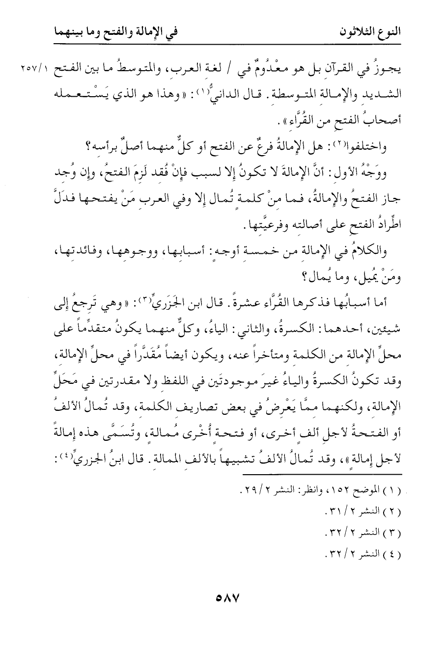 1194 أما أسبابها فذكرها القراء عشرة قال ابن الجزري وهي ترجع إلى شيئين أحدهما الكسرة والثاني الياء وكل منهما يكون متقدما على محل الإمالة من الكلمة أو متأخرا عنه ويكون أيضا مقدرا في محل الإمالة وقد تكون الكسرة والياء غير موجودتين في اللفظ ولا مقدرتين في محال الإمالة ولكنهما مما يعرض في بعض تصاريف الكلمة وقد تمال الألف أو الفتحة لأجل ألف أخرى أو فتحة أخرى ممالة وتسمى هذه إمالة لأجل إمالة وقد تمال الألف تشبيها بالألف الممالة