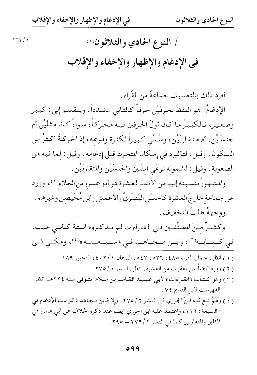 1225 فالكبير ما كان أول الحرفين فيه متحركا سواء كانا مثلين أم جنسين أم متقاربين وسمي كبيرا لكثرة وقوعه إذ الحركة أكثر من السكون وقيل لتأثيره في إسكان المتحرك قبل إدغامه وقيل لما فيه من الصعوبة وقيل لشموله نوعي المثلين والجنسين والمتقاربين والمشهور بنسبته إليه من الإئمة العشرة هو أبو عمرو بن العلاء وورد عن جماعة خارج العشرة كالحسن البصري والأعمش وابن محيصن وغيرهم