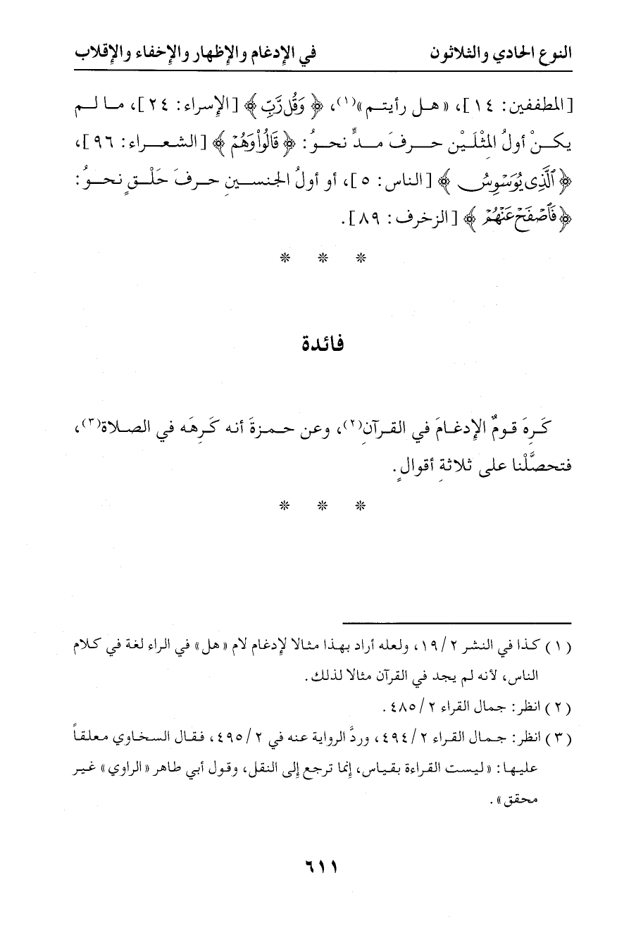 1252 كره قوم الإدغام في القرآن وعن حمزة أنه كرهه في الصلاة فتحصلنا على ثلاثة أقوال