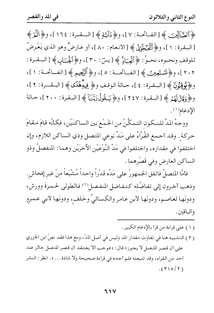 1269 فأما المتصل فاتفق الجمهور على مده قدرا واحدا مشبعا من غير إفحاش