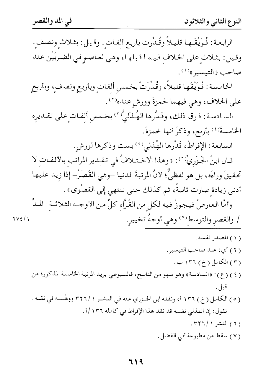 السابعة الإفراط قدرها الهذلي بست وذكرها لورش قال ابن الجزري وهذا الاختلاف في تقدير المراتب بالألفات لا تحقيق وراءه بل هو لفظي لأن المرتبة الدنيا وهي القصر إذا زيد عليها أدنى زيادة صارت ثانية ثم كذلك حتى تنتهي إلى القصوى