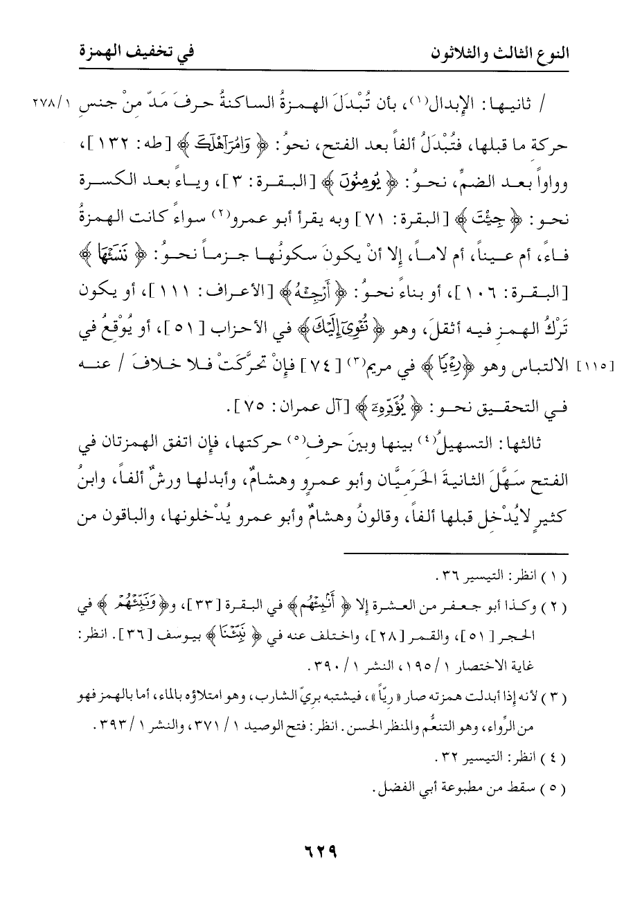 وثانيها الإبدال بأن تبدل الهمزة الساكنة حرف مد من جنس حركة ما قبلها فتبدل ألفا بعد الفتح نحو { وأمر أهلك } وواوا بعد الضم نحو يومنون وياء بعد الكسر نحو جيت وبه يقرأ أبو عمرو وسواء كانت الهمزة فاء أم عينا أم لاما إلا أن يكون سكونها جزما نحو ننسأها أو بناء نحو أرجئه أو يكون ترك الهمز فيه أثقل وهو { وتؤوي إليك } في الأحزاب أو يوقع في الالتباس وهو { ورئيا } في مريم فإن تحركت فلا خلاف عنه في التحقيق نحو { يؤوده }