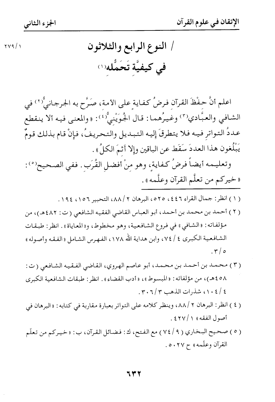 1285 م قال الجويني والمعنى فيه ألا ينقطع عدد التواتر فيه فلا يتطرق إليه التبديل والتحريف فإن قام بذلك قوم يبلغون هذا العدد سقط عن الباقين وإلا أثم الكل