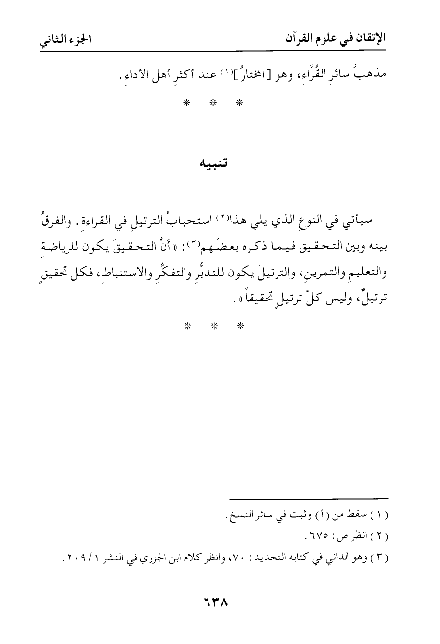 1291 سيأتي في النوع الذي يلي هذا استحباب الترتيل في القراءة والفرق بينه وبين التحقيق فيما ذكره بعضهم أن التحقيق يكون للرياضة والتعليم والتمرين والترتيل يكون للتدبر والتفكر والاستنباط فكل تحقيق ترتيل وليس كل ترتيل تحقيقا