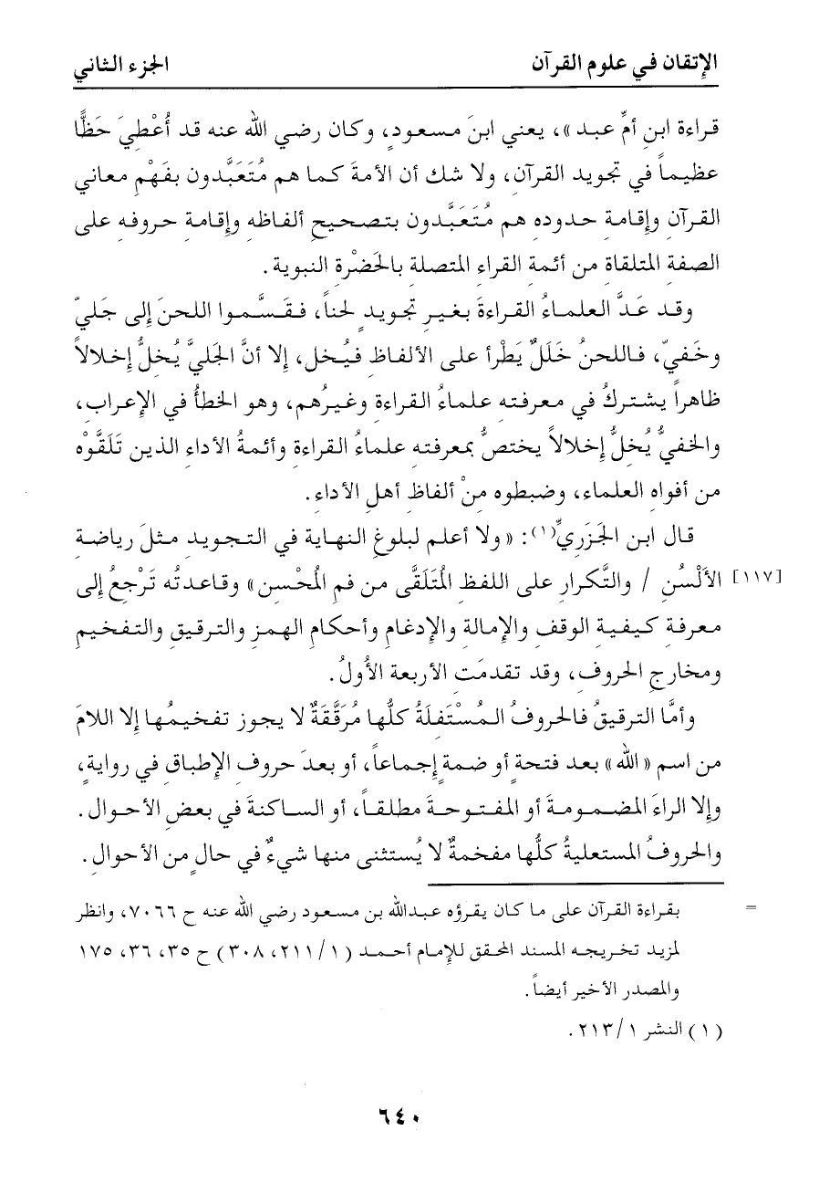قراءة ابن أم عبد يعني ابن مسعود وكان رضي الله عنه قد أعطي حظا عظيما في تجويد القرآن ولا شك أن الأمة كما هم متعبدون بفهم معاني القرآن وإقامة حدوده هم متعبدون بتصحيح ألفاظه وإقامة حروفه على الصفة المتلقاة من أئمة القراء المتصلة بالحضرة النبوية وقد عد العلماء القراءة بغير تجويد لحنا فقسموا اللحن إلى جلي وخفي فاللحن خلل يطرأ على الألفاظ فيخل إلا أن الجلي يخل إخلالا ظاهرا يشترك في معرفته علماء القراءة وغيرهم وهو الخطأ في الإعراب والخفي يخل إخلالا يختص بمعرفته علماء القراءة وأئمة الأداء الذين تلقوه من أفواه العلماء وضبطوه من ألفاظ أهل الأداء