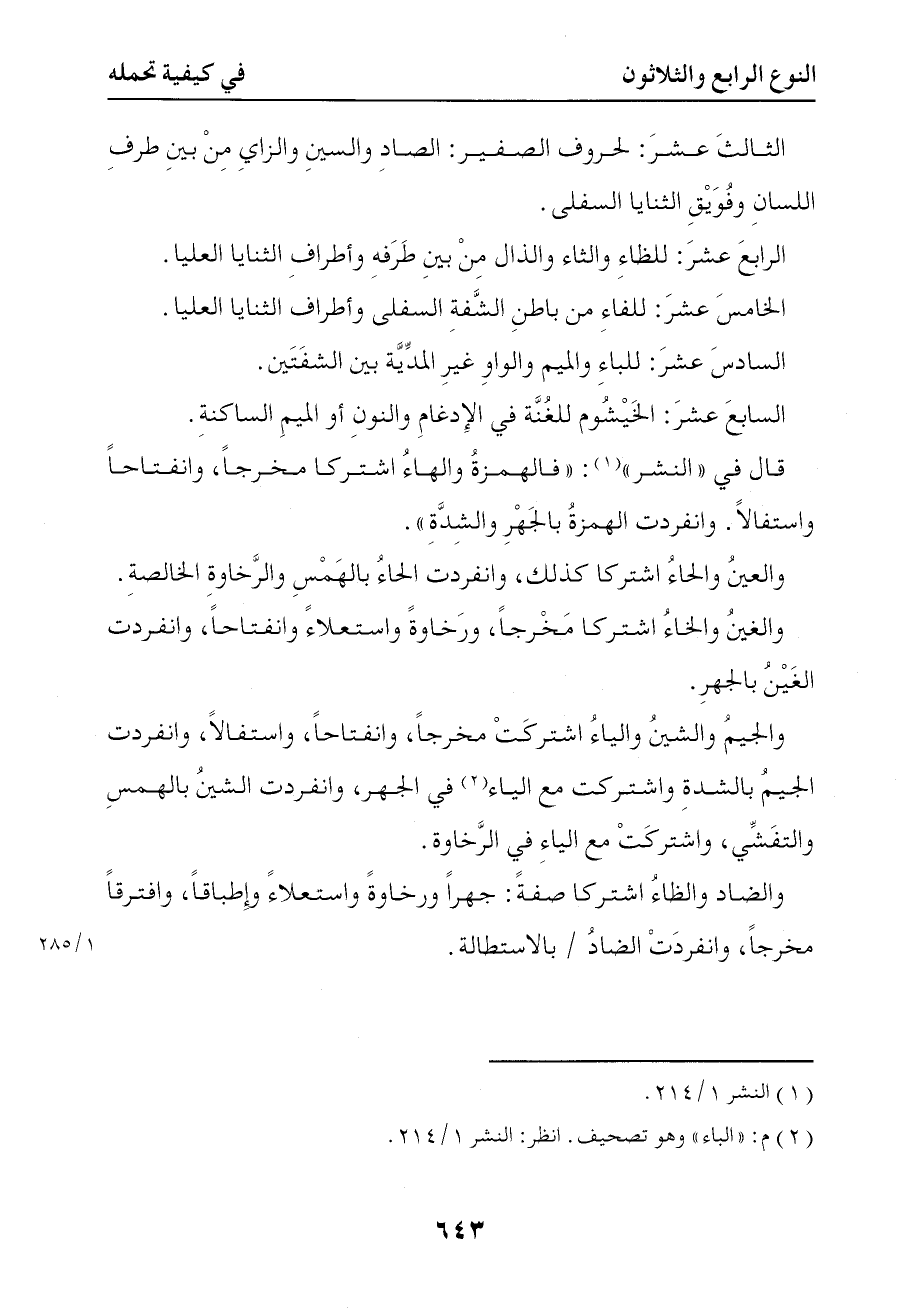 1299 قال في النشر فالهمزة والهاء اشتركا مخرجا وانفتاحا واستفالا وانفردت الهمزة بالجهر والشدة والعين والحاء اشتركا كذلك وانفردت الحاء بالهمس والرخاوة الخالصة والغين والخاء اشتركا مخرجا ورخاوة واستعلاء وانفتاحا وانفردت الغين بالجهر والجيم والشين والياء اشتركت مخرجا وانفتاحا واستفالا وانفردت الجيم بالشدة واشتركت مع الياء في الجهر وانفردت الشين بالهمس والتفشي واشتركت مع الياء في الرخاوة والضاد والظاء اشتركا صفة جهرا ورخاوة واستعلاء واطباقا وافترقا مخرجا وانفردت الضاد بالاستطالة