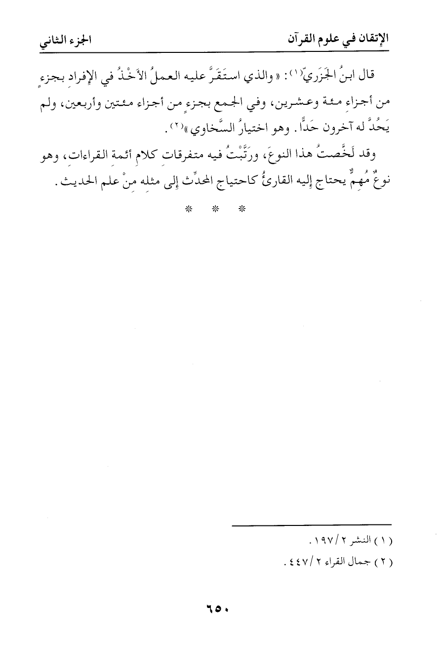1309 قال ابن الجزري والذي استقر عليه العمل الأخذ في الإفراد بجزء من أجزاء مائة وعشرين وفي الجمع بجزء من أجزاء مائتين وأربعين ولم يحد له آخرون حدا وهو اختيار السخاوي
