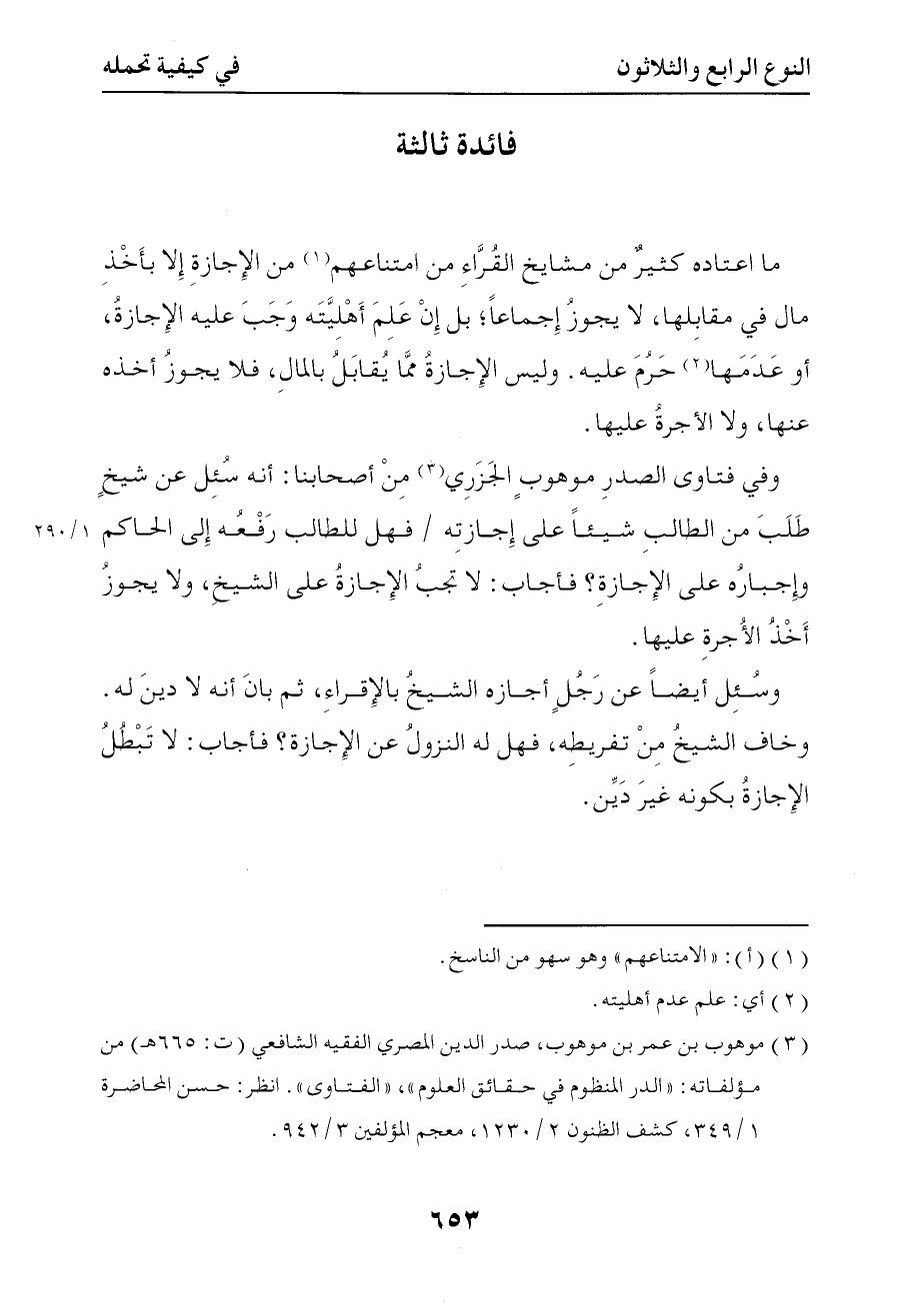 1313 ما اعتاده كثير من مشايخ القراء من امتناعهم من الإجازة إلا بأخذ مال في مقابلها لا يجوز إجماعا بل إن علم أهليته وجب عليه الإجازة أو عدمها حرم عليه وليست الإجازة مما يقابل بالمال فلا يجوز أخذه عنها ولا الأجرة عليها