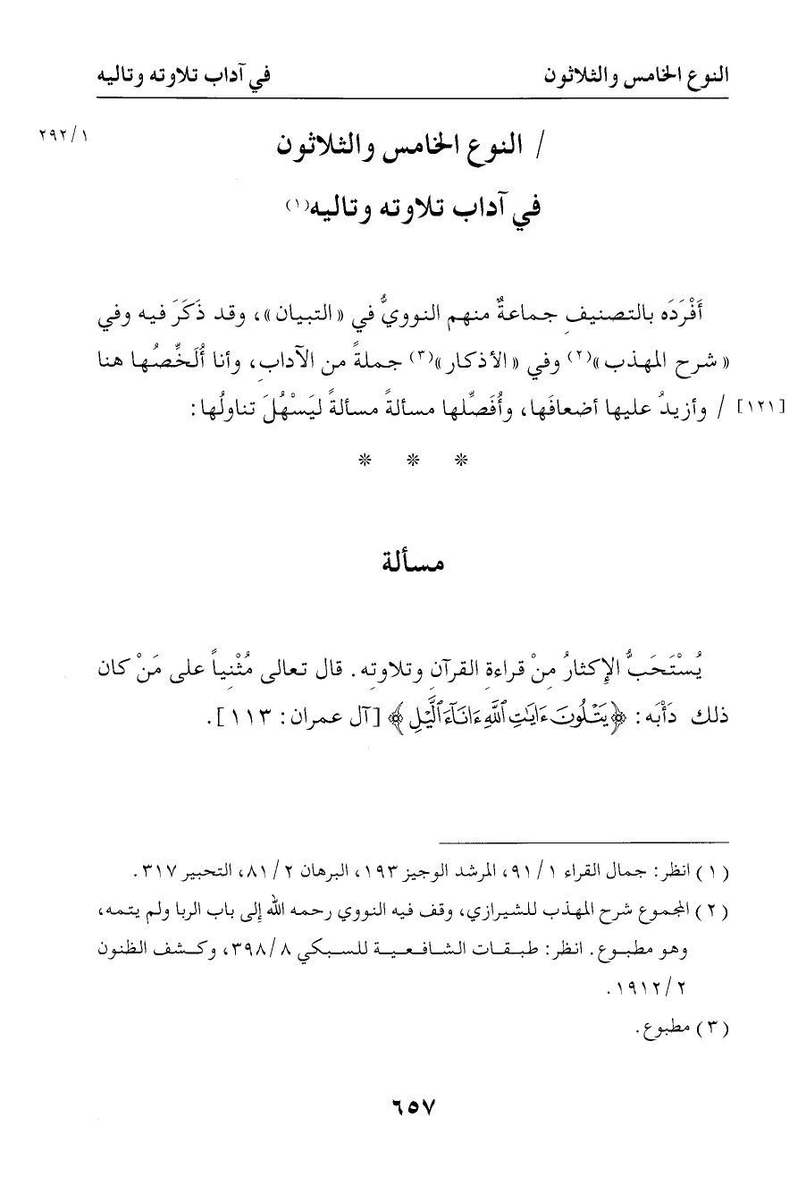 1320 أفرده بالتصنيف جماعة منهم النووي في التبيان وقد ذكر فيه وفي شرح المهذب وفي الأذكار جملة من الآداب وأنا ألخصها هنا وأزيد عليها أضعافها وأفصلها مسألة مسألة ليسهل تناولها 1 - مسألة