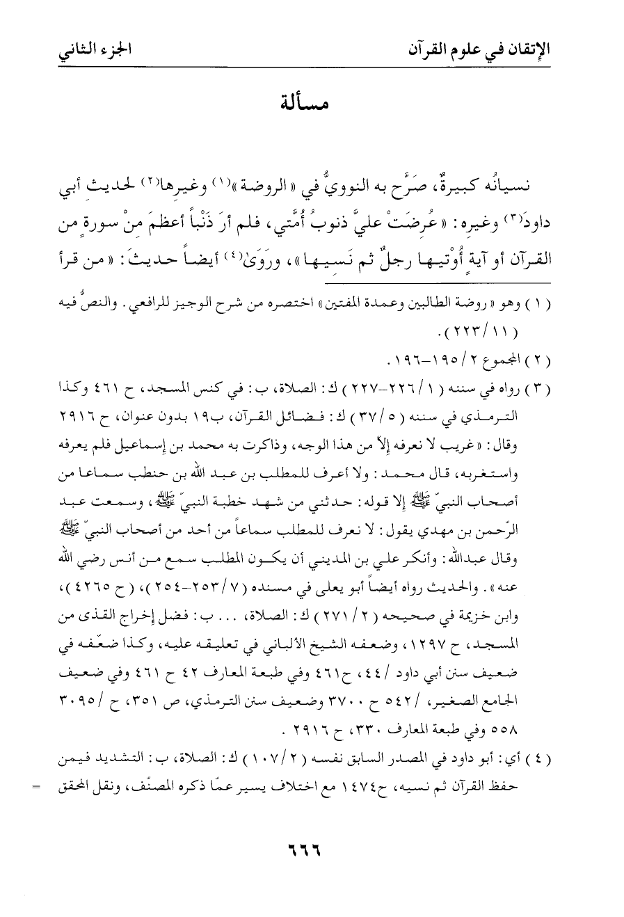1346 نسيانه كبيرة صرح به النووي في الروضة وغيرها لحديث أبي داود وغيره عرضت علي ذنوب أمتي فلم أر ذنبا أعظم من سورة من القرآن أو آية أوتيها رجل ثم نسيها