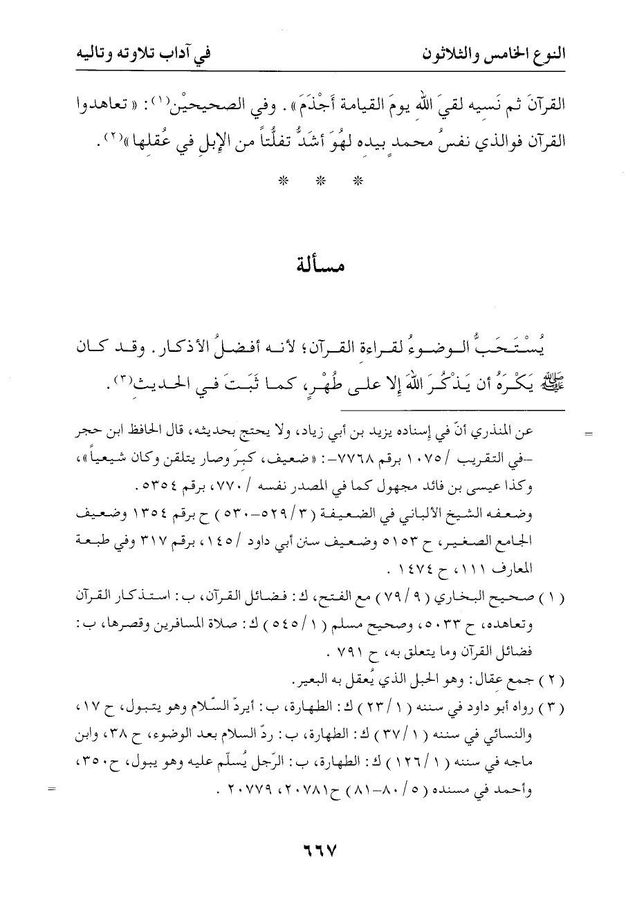 1348 وفي الصحيحين تعاهدوا القرآن فوالذي نفس محمد بيده لهو أشد تفلتا من الإبل في عقلها 3 - مسألة