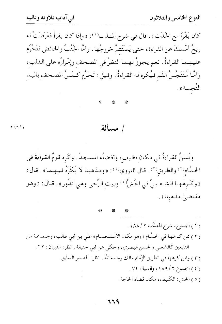 1352 وتسن القراءة في مكان نظيف وأفضله المسجد وكره قوم القراءة في الحمام والطريق قال النووي ومذهبنا لا تكره فيهما قال وكرهها الشعبي في الحش وبيت الرحا وهي تدور قال وهو مقتضى مذهبنا