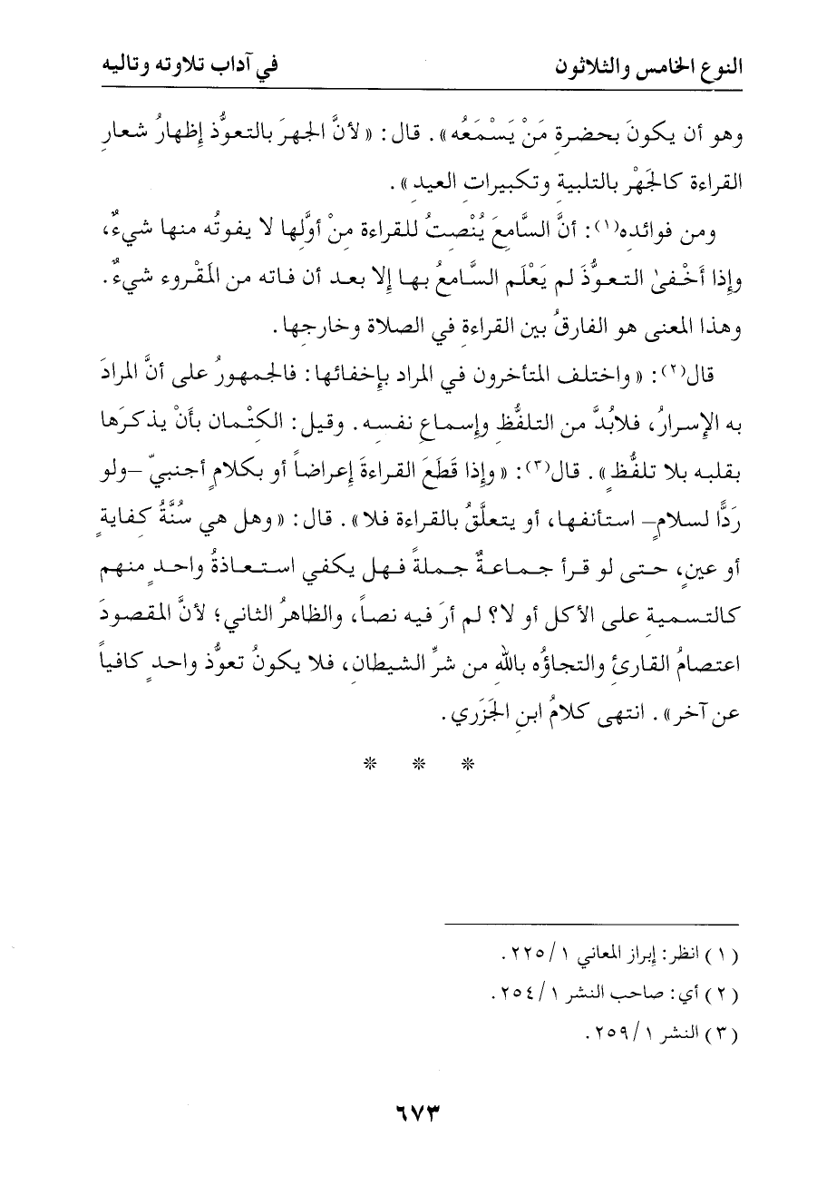 1366 قال وإذا قطع القراءة إعراضا أو بكلام أجنبي ولو رد السلام استأنفها أو يتعلق بالقراءة فلا قال وهل هي سنة كفاية أو عين حتى لو قرأ جماعة جملة فهل يكفي استعاذة واحد منهم كالتسمية على الأكل أو لا لم أر فيه نصا والظاهر الثاني لأن المقصود اعتصام القارئ والتجاؤه بالله من شر الشيطان فلا يكون تعوذ واحد كافيا عن آخر انتهى كلام ابن الجزري