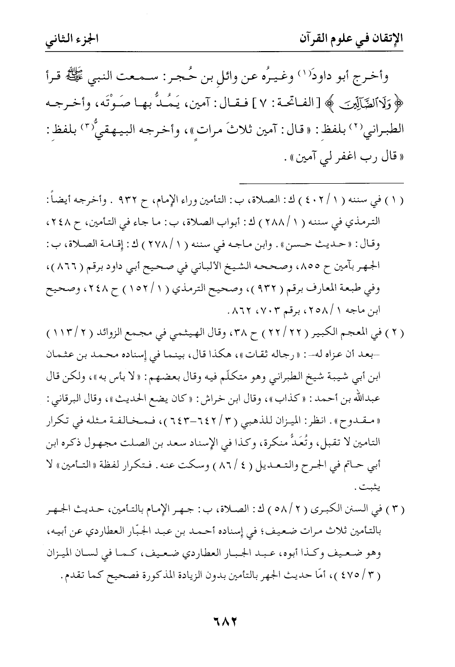 1388 وأخرج أبو داود وغيره عن وائل بن حجر سمعت النبي صلى الله عليه وسلم قرأ { ولا الضالين } فقال آمين يمد بها صوته