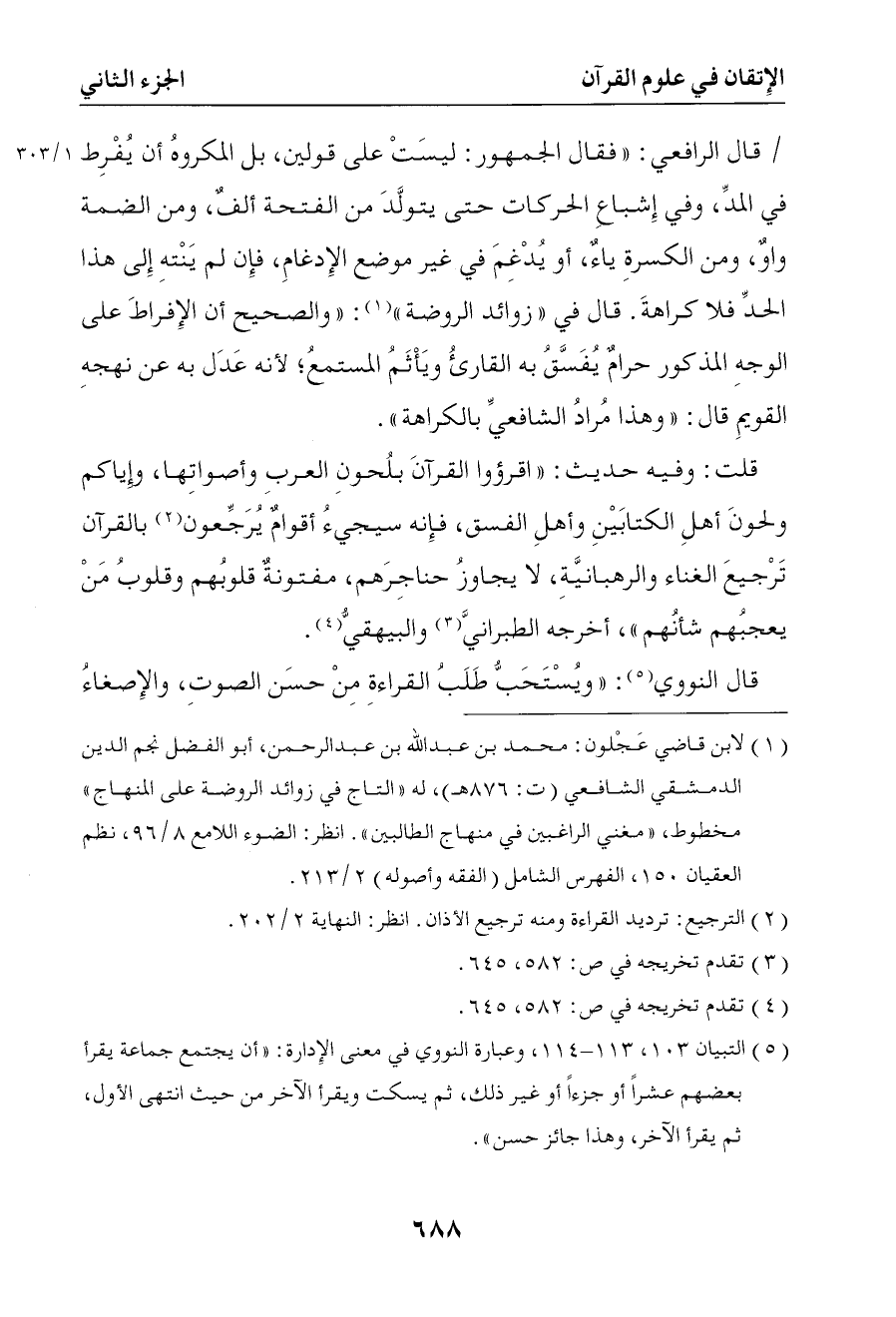 1405 قال الرافعي قال الجمهور ليست على قولين بل المكروه أن يفرط في المد وفي إشباع الحركات حتى يتولد من الفتحة ألف ومن الضمة واو ومن الكسرة ياء أو يدغم في غير موضع الإدغام فإن لم ينته إلى هذا الحد فلا كراهة