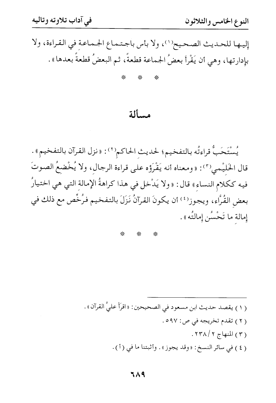 إليها للحديث الصحيح ولا بأس باجتماع الجماعة في القراءة ولا بإدارتها وهي أن يقرأ بعض الجماعة قطعة ثم البعض قطعة بعدها 15 - مسألة