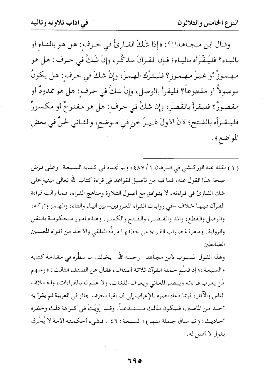 1421 وقال ابن مجاهد إذا شك القارئ في حرف هل بالتاء أو بالياء فليقرأه بالياء فإن القرآن مذكر وإن شك في حرف هل هو مهموز أو غير مهموز فليترك الهمز وإن شك في حرف هل يكون موصولا أو مقطوعا فليقرأ بالوصل وإن شك في حرف هل هو ممدود أو مقصور فليقرأ بالقصر وإن شك في حرف هل هو مفتوح أو مكسور فليقرأ بالفتح لأن الأول غير لحن في موضع والثاني لحن في بعض المواضع