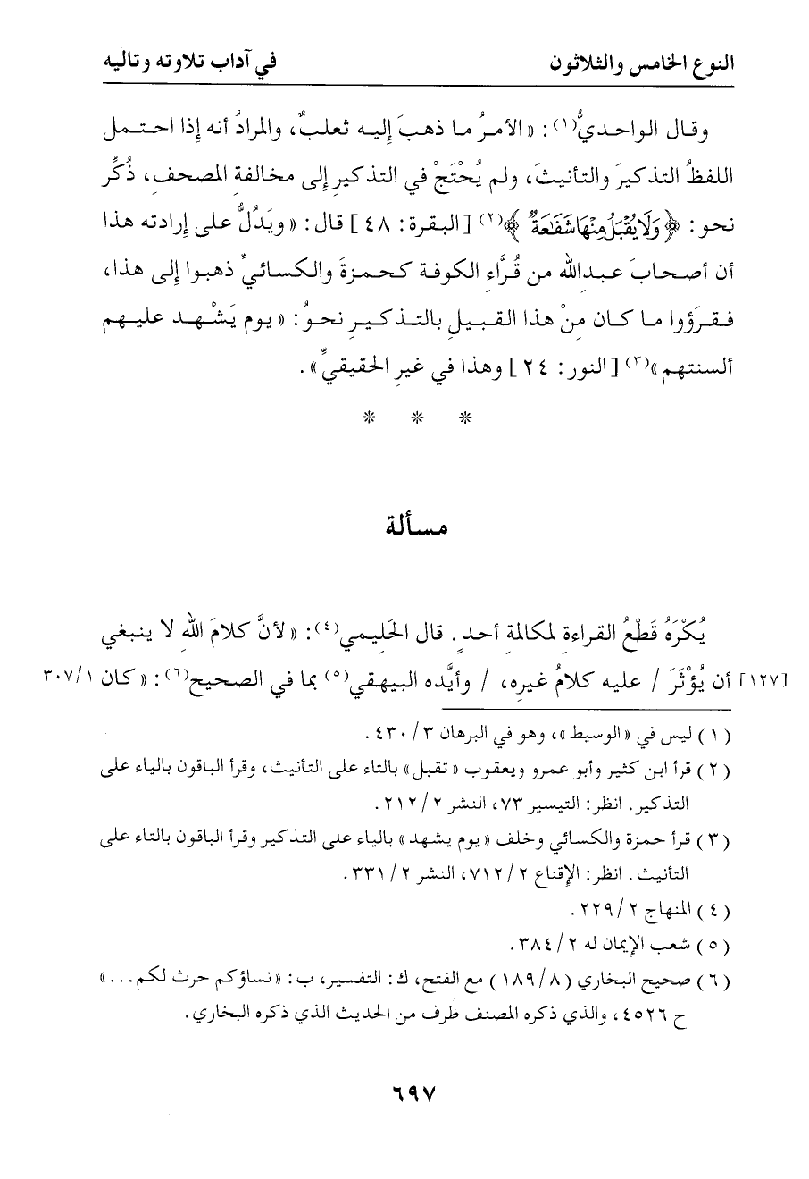 1425 وقال الواحدي الأمر ما ذهب إليه ثعلب والمراد أنه إذا احتمل اللفظ التذكير والتأنيث ولم يحتج في التذكير إلى مخالفة المصحف ذكر نحو { ولا يقبل منها شفاعة } قال ويدل على إرادة هذا أن أصحاب عبد الله من قراء الكوفة كحمزة والكسائي ذهبوا إلى هذا فقرؤوا ما كل من هذا القبيل بالتذكير نحو يوم يشهد عليهم ألسنتهم وهذا في غير الحقيقي 19 - مسألة