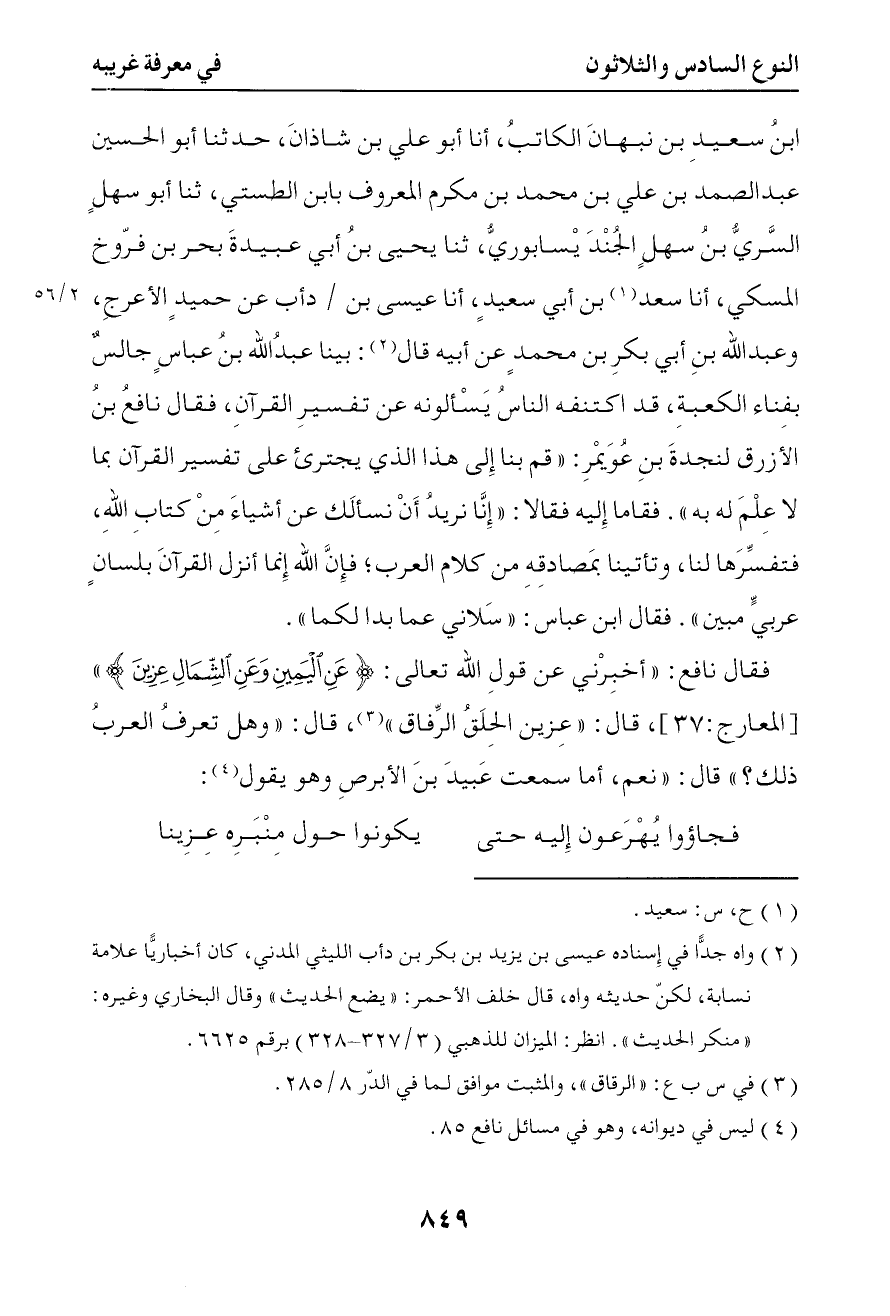 بن سعيد بن نبهان الكاتب أنبأنا أبو علي بن شاذان حدثنا أبو الحسين عبد الصمد بن علي بن مكرم المعروف بابن الطسي حدثنا أبو سهل السري الجنديسابوري حدثنا يحيى بن أبي عبيدة بحر بن فروخ المكي أنبأنا سعيد بن أبي سعيد أنبأنا عيسى بن دأب عن حميد الأعرج وعبد الله بن أبي بكر بن محمد عن أبيه قال بينا عبد الله بن عباس جالس بفناء الكعبة قد اكتنفه الناس يسألونه عن تفسير القرآن فقال نافع بن الأزرق لنجدة بن عويمر قم بنا إلى هذا الذي يجترئ على تفسير القرآن بما لا علم له به فقاما إليه فقالا إنا نريد أن نسألك عن أشياء من كتاب الله فتفسرها لنا وتأتينا بمصادقة من كلام العرب فإن الله تعالى إنما أنزل القرآن بلسان عربي مبين فقال ابن
